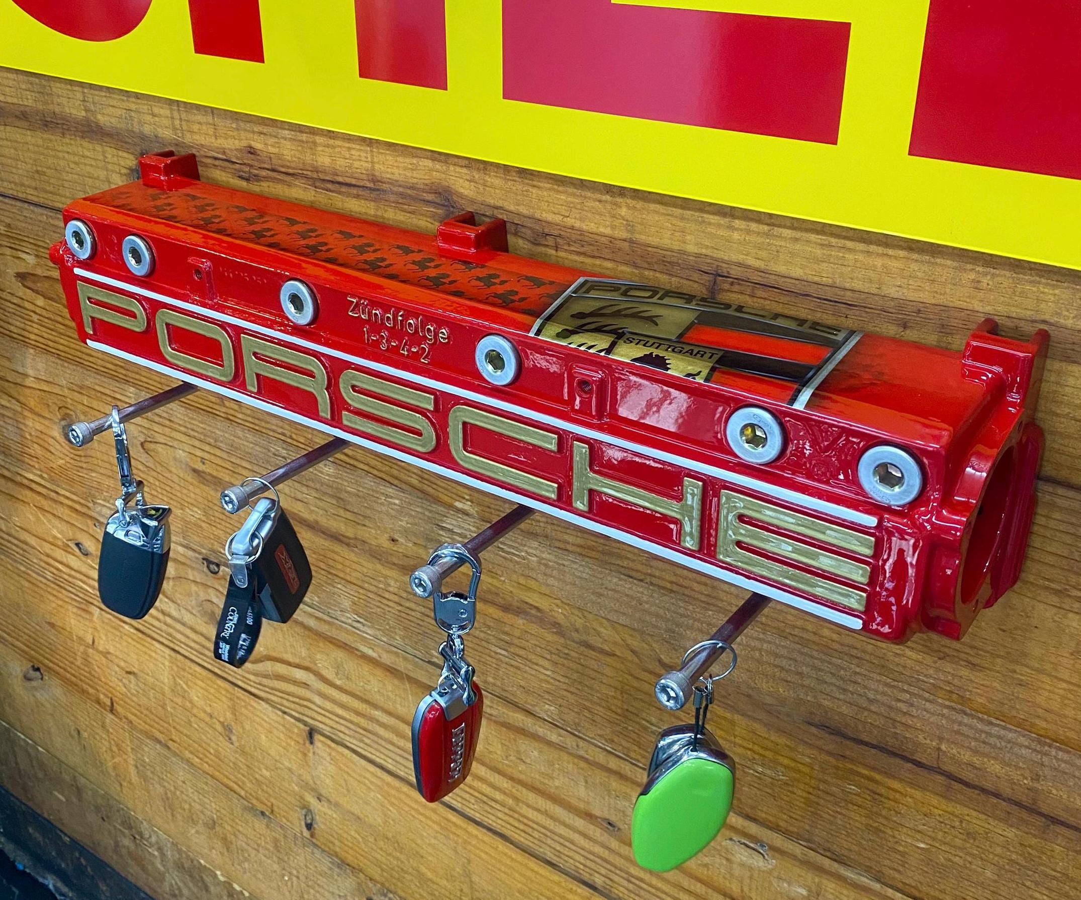 Upgrade your key organization with this Porsche 944 924S Cam Tower Housing Valve Cover Key Holder. A stunning piece painted in Porsche Guards Red. This unique accessory features custom airbrushed Porsche logos and hand-painted Porsche lettering, making it a true collector's item for automotive enthusiasts. With durable stainless steel bolt hangers, titanium nuts, and zinc-plated oil drain plugs, this key holder combines style and functionality, ensuring your keys are always within reach while showcasing your passion for Porsche