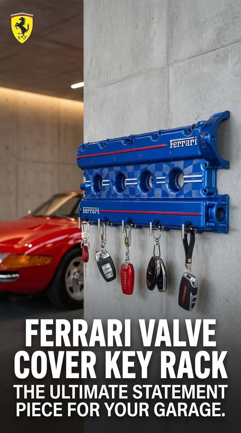 Upgrade your key organization with this custom Ferrari Mondial Valve Cover Key Holder. A stunning piece painted in Blu Corsa. This unique accessory features a custom airbrushed checkered flag and hand-painted lettering, making it a true collector's item for automotive enthusiasts. With durable stainless steel bolt hangers, this key holder combines style and functionality, ensuring your keys are always within reach while showcasing your passion for Ferrari.