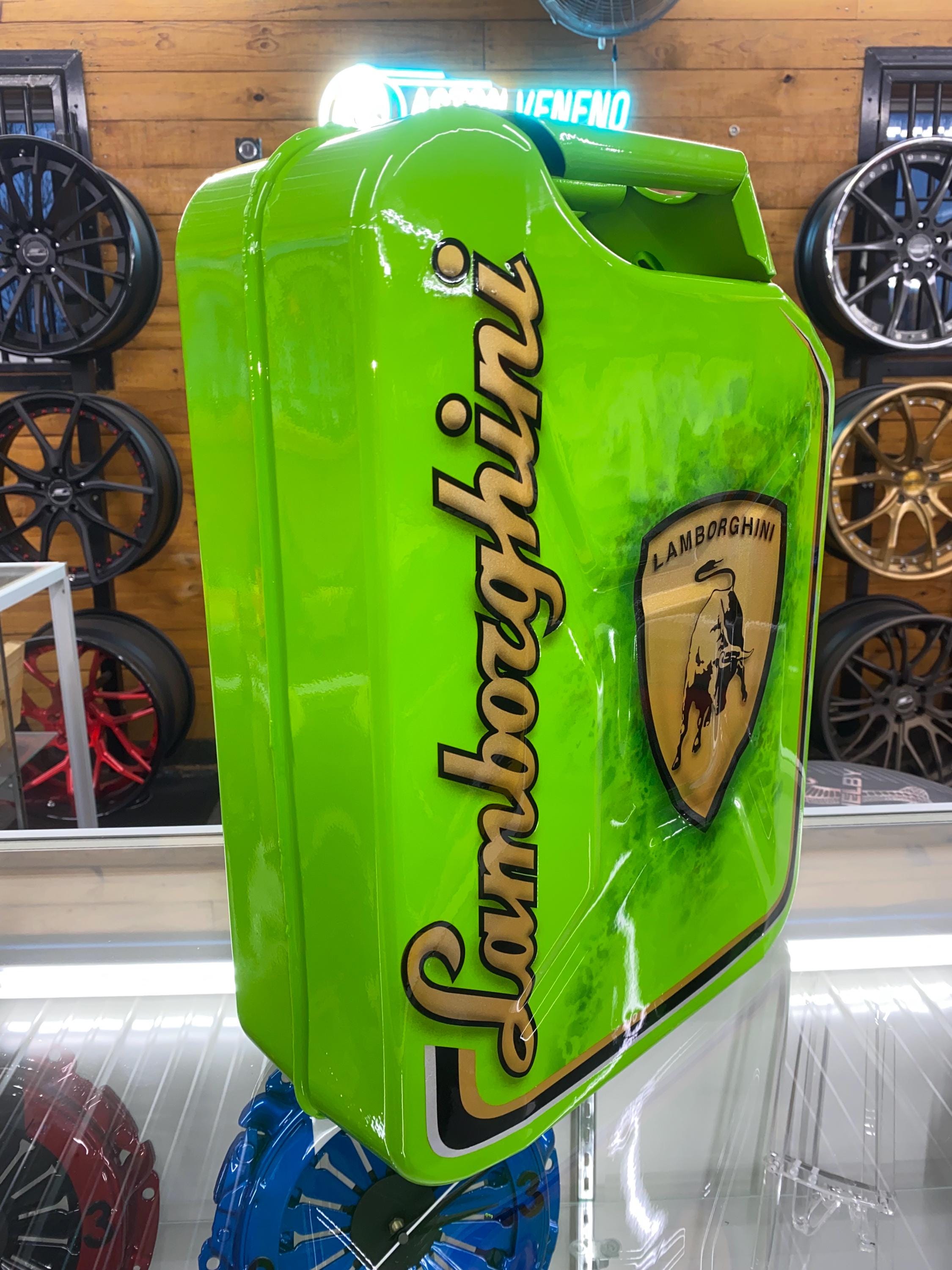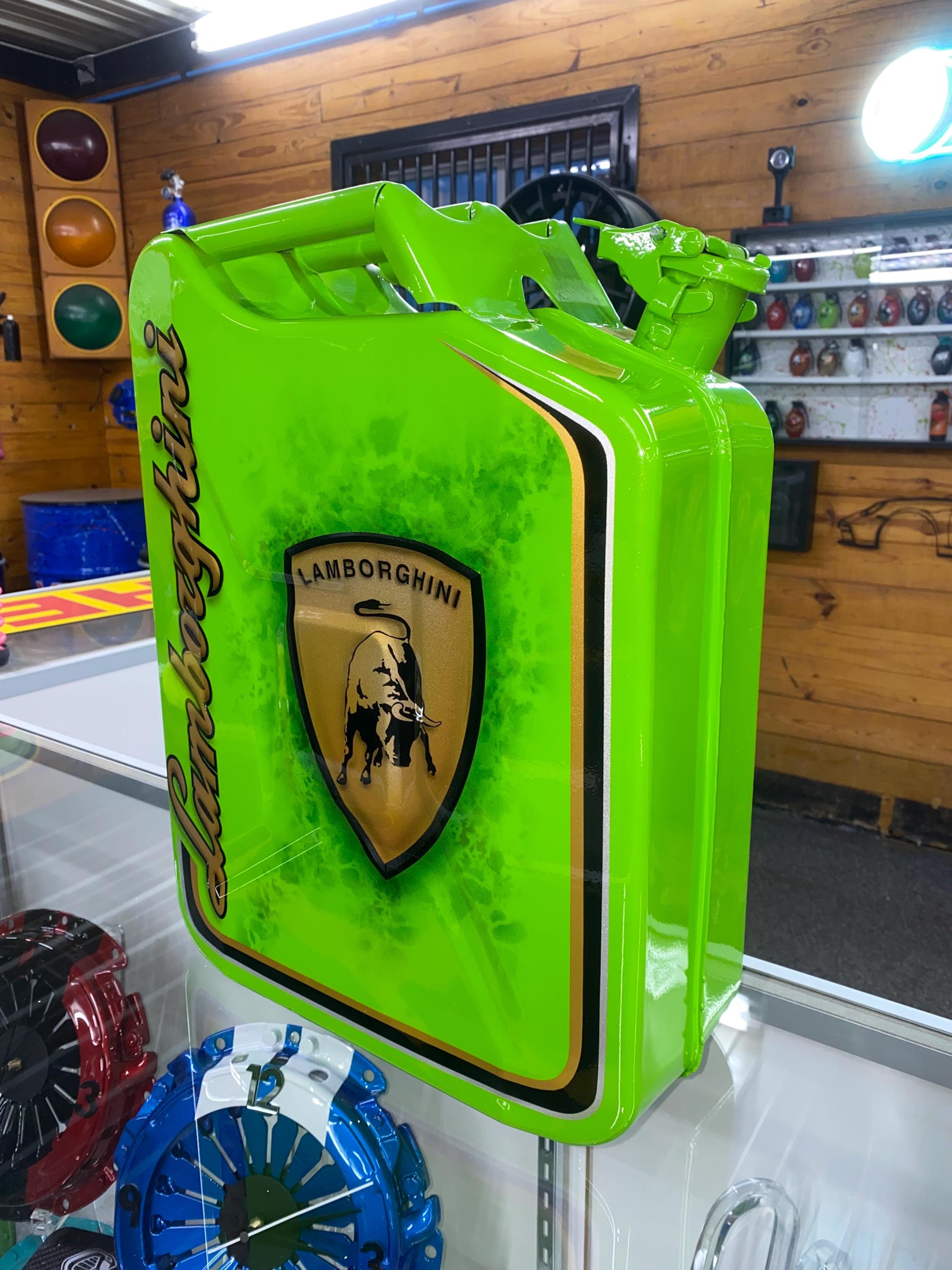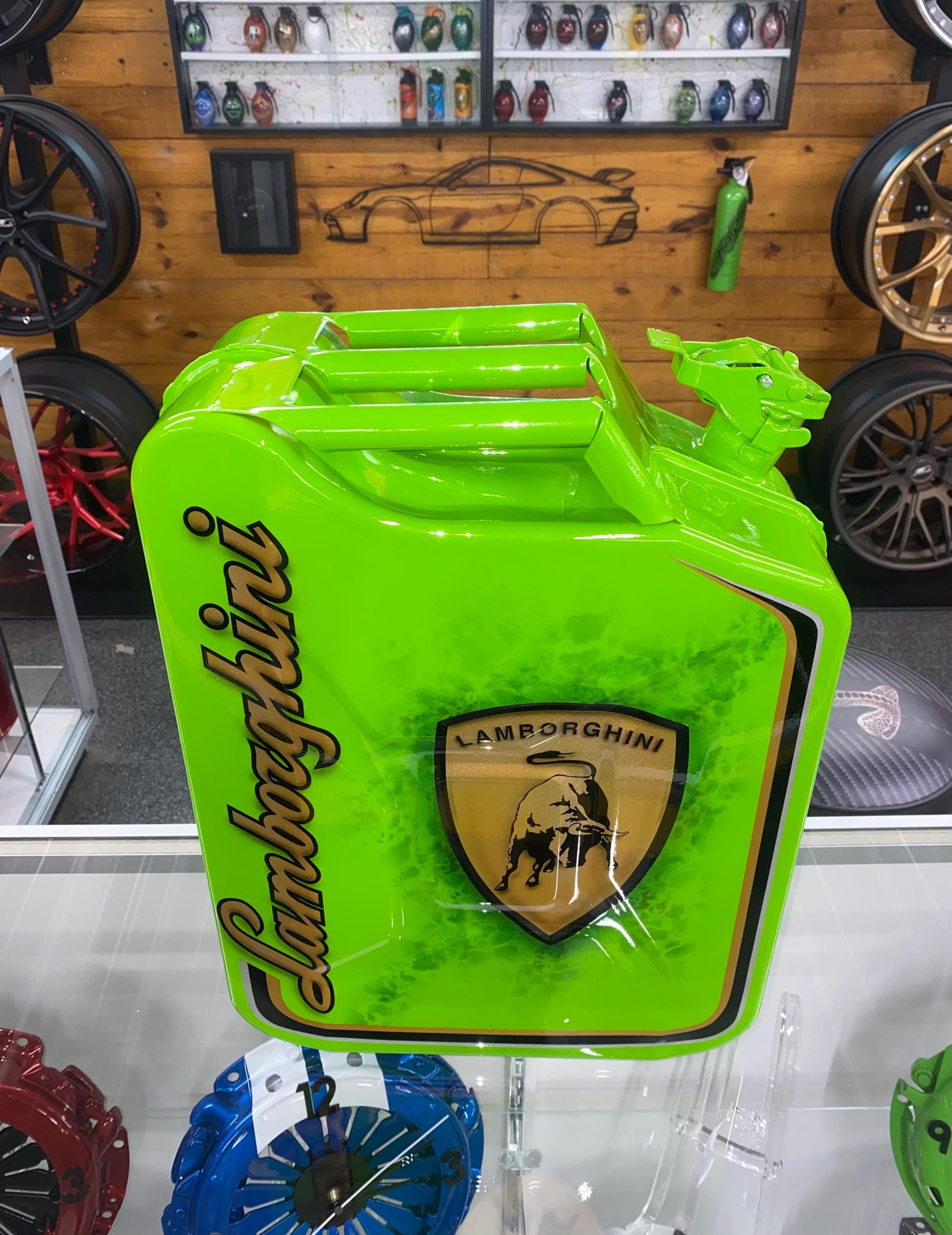 Lamborghini delivers quality & this customized 5 Gallon Jerry can delivers it right back. This work of art is unique with Lamborghini Factory Paint - Verde Mantis. This beatiful green tri-coat paint job is followed with a custom airbrushed Lamborghini design!