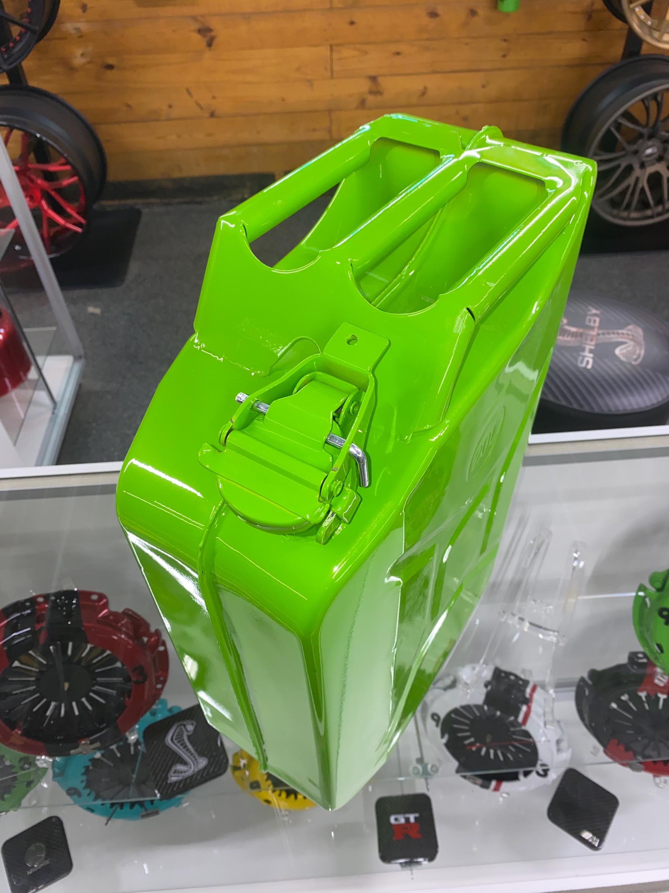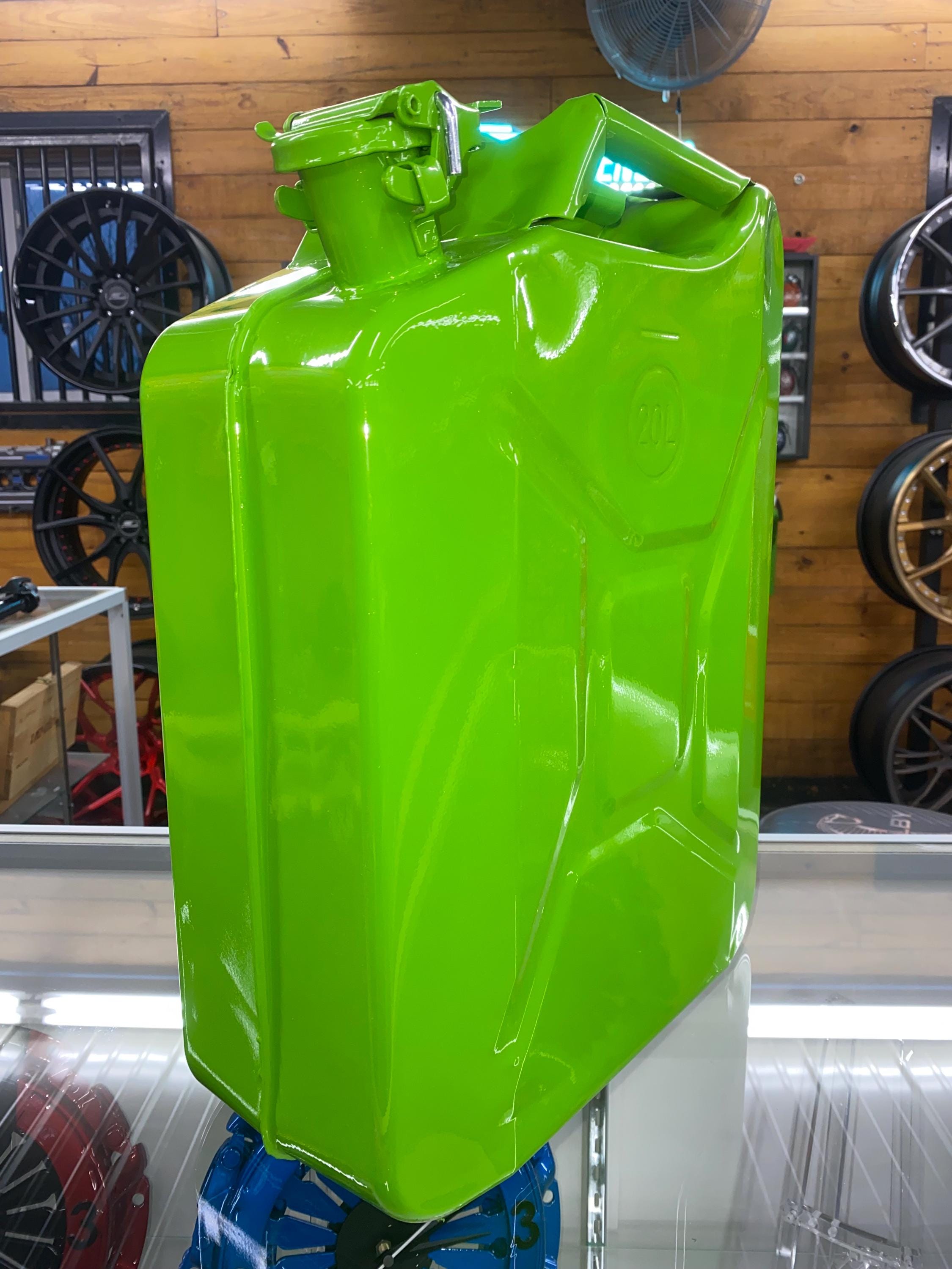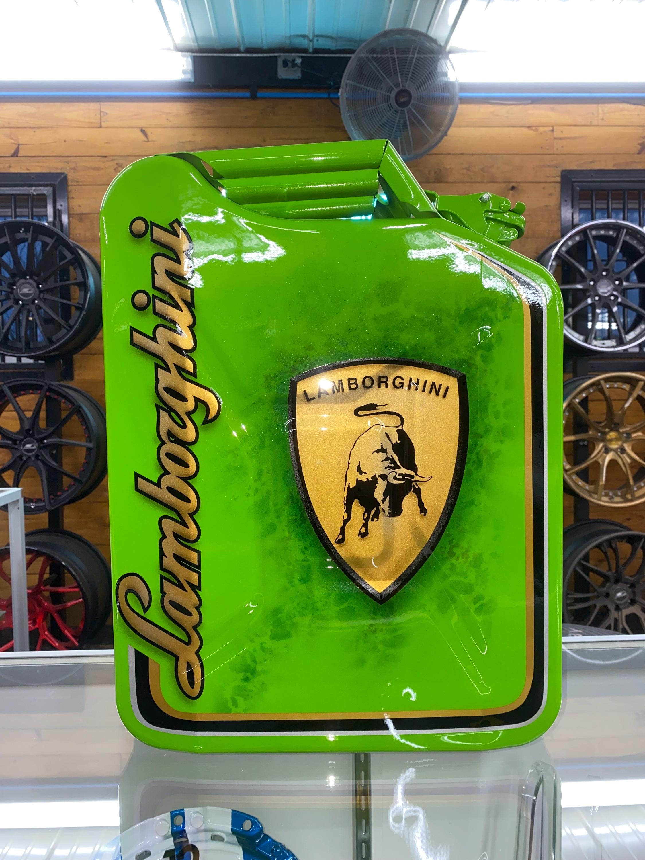 Lamborghini delivers quality & this customized 5 Gallon Jerry can delivers it right back. This work of art is unique with Lamborghini Factory Paint - Verde Mantis. This beatiful green tri-coat paint job is followed with a custom airbrushed Lamborghini design!
