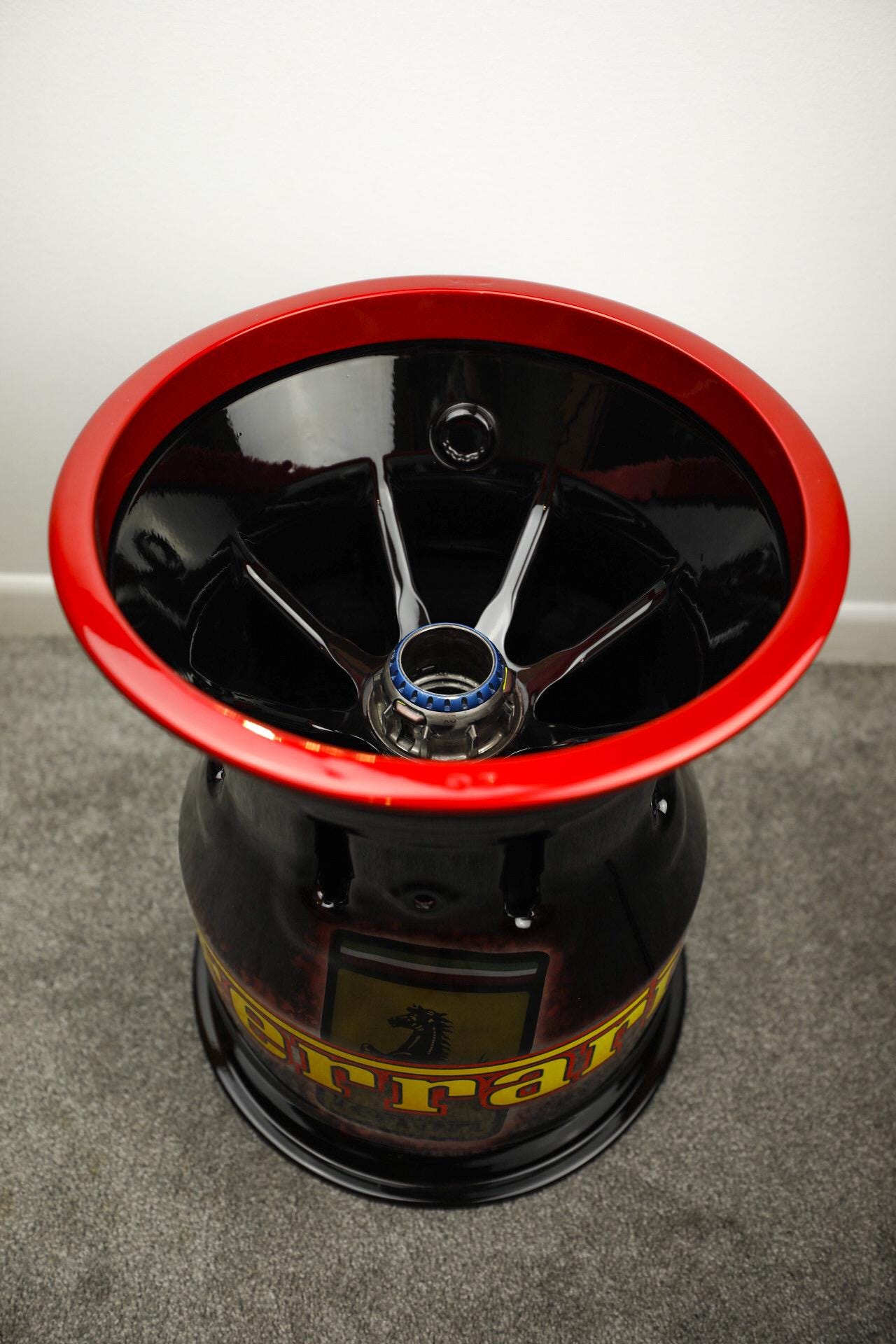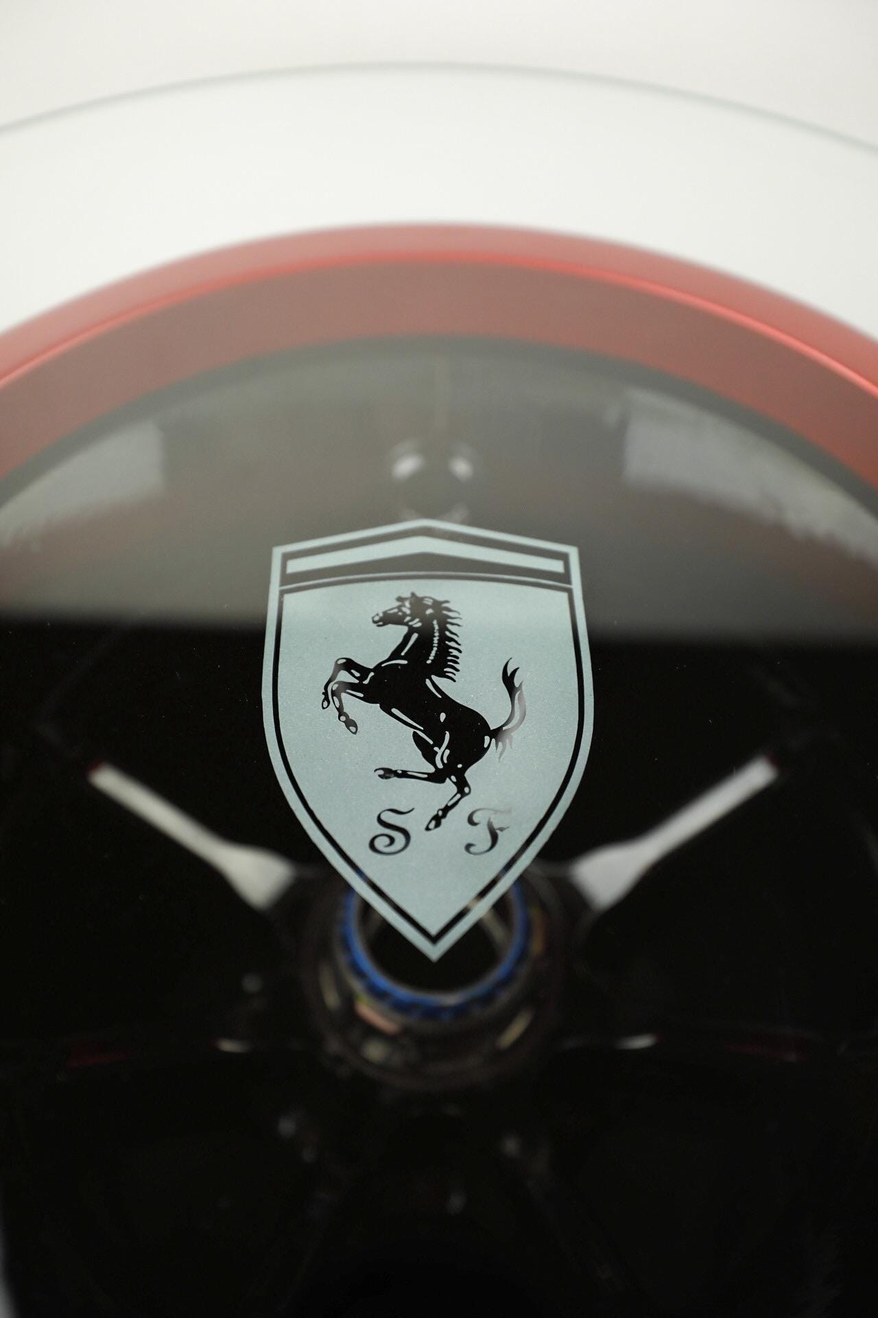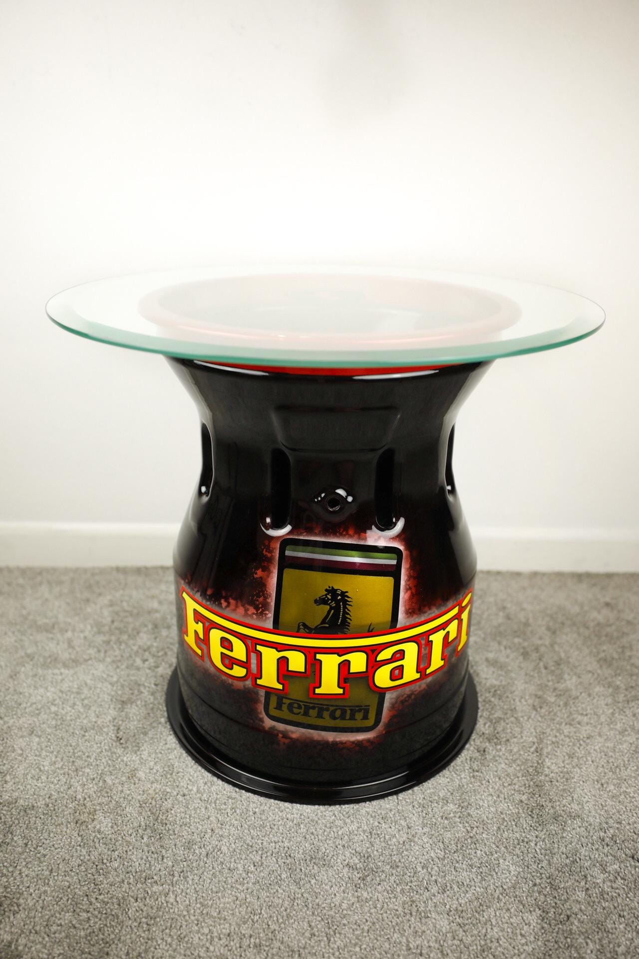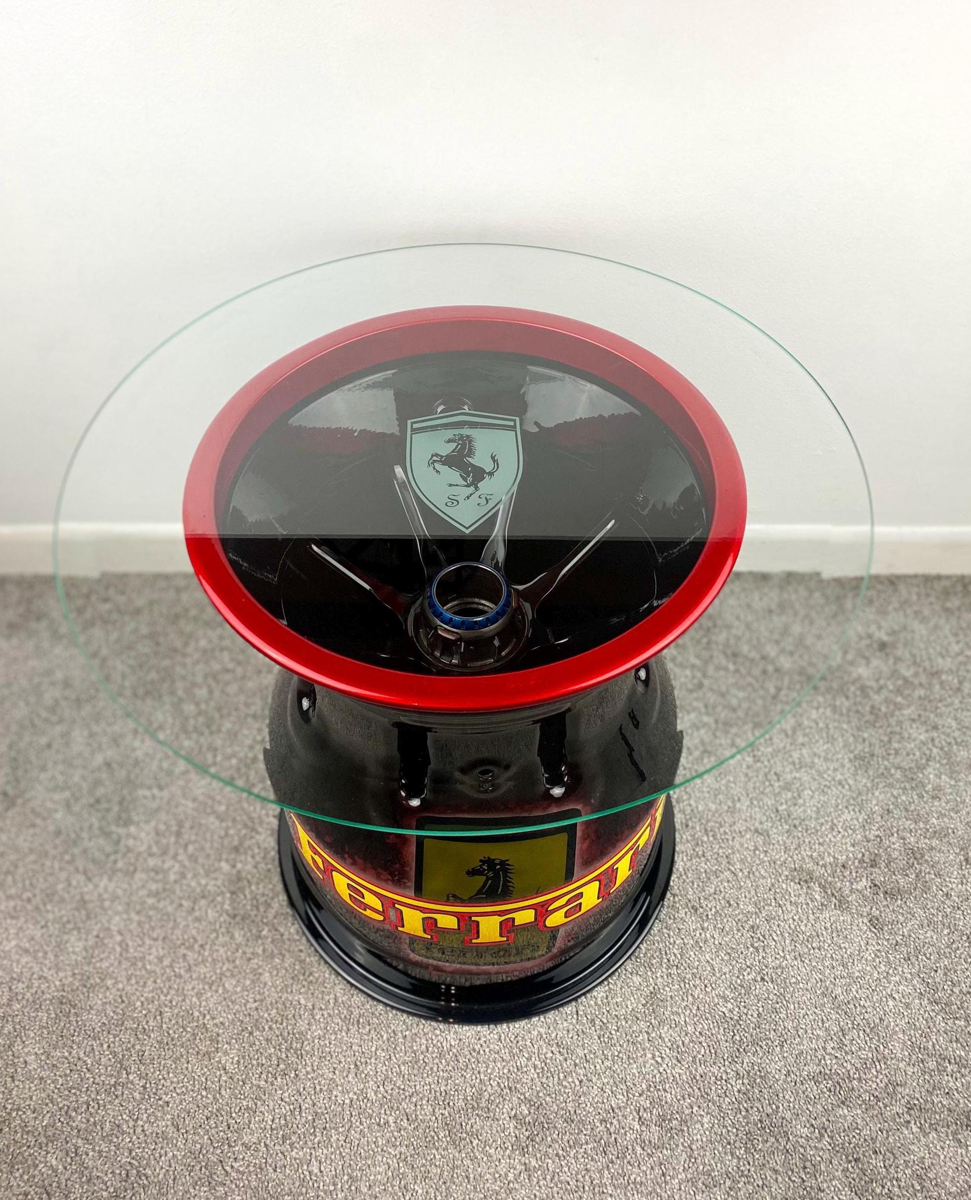 Experience the thrill of Formula 1 with this super rare Ferrari Formula 1 Wheel. This unique piece features a custom airbrushed design using an authentic race-used wheel that captures the essence of high-speed racing. A beveled sheet of glass lays on top with a Ferrari etched logo. A perfect match for motorsport enthusiasts, this table not only serves as a stunning conversation starter but also embodies the spirit of innovation and performance.