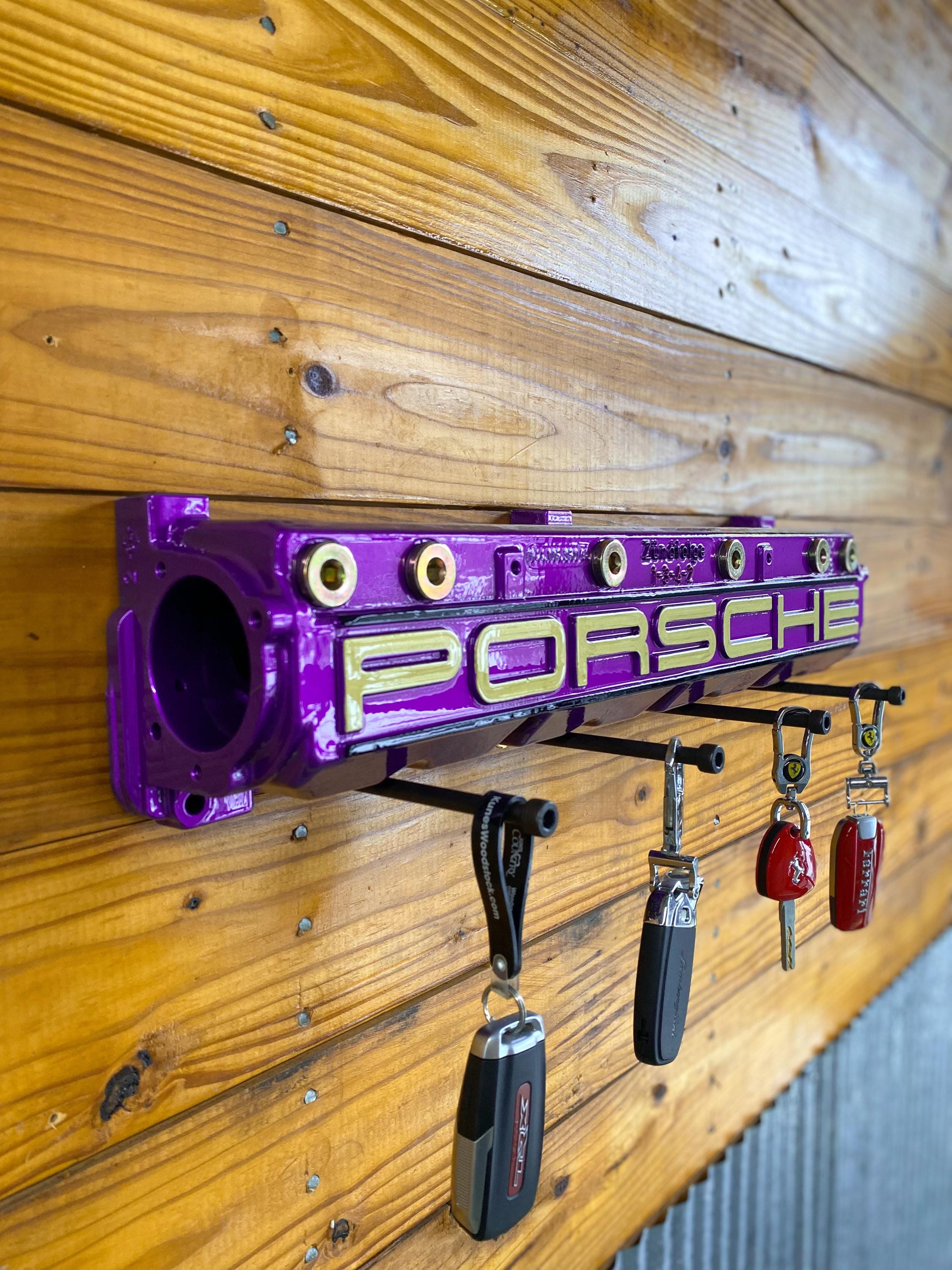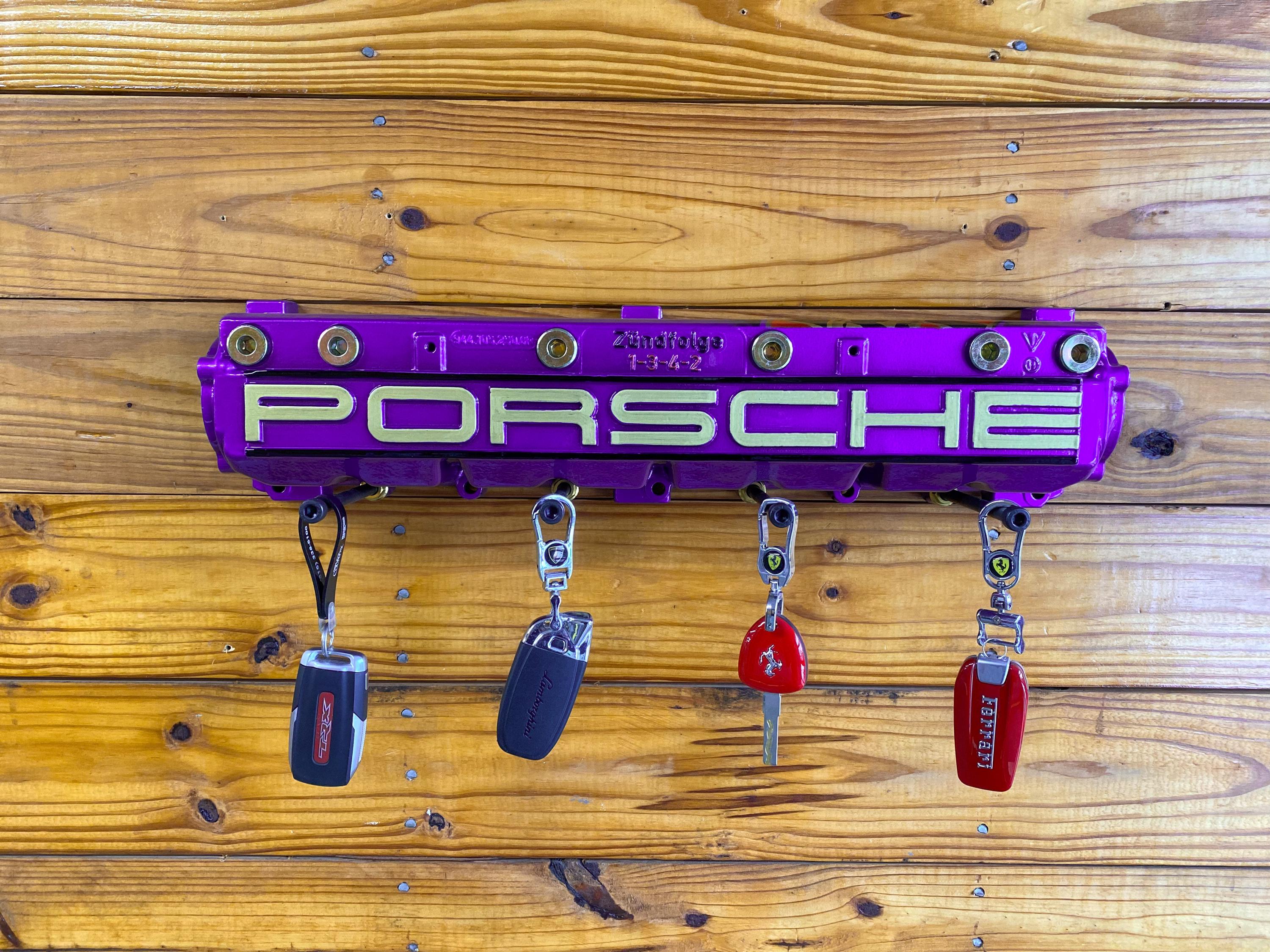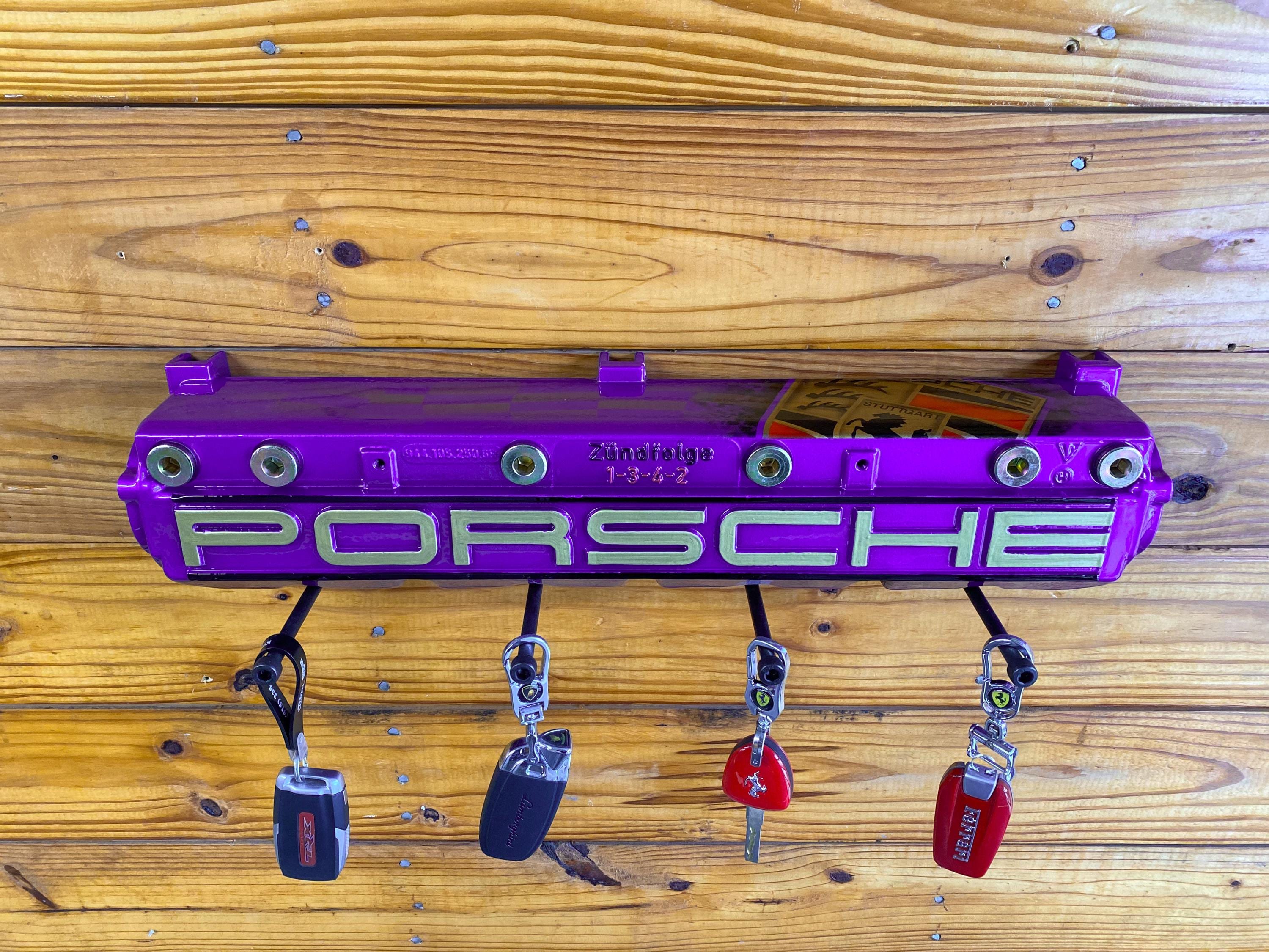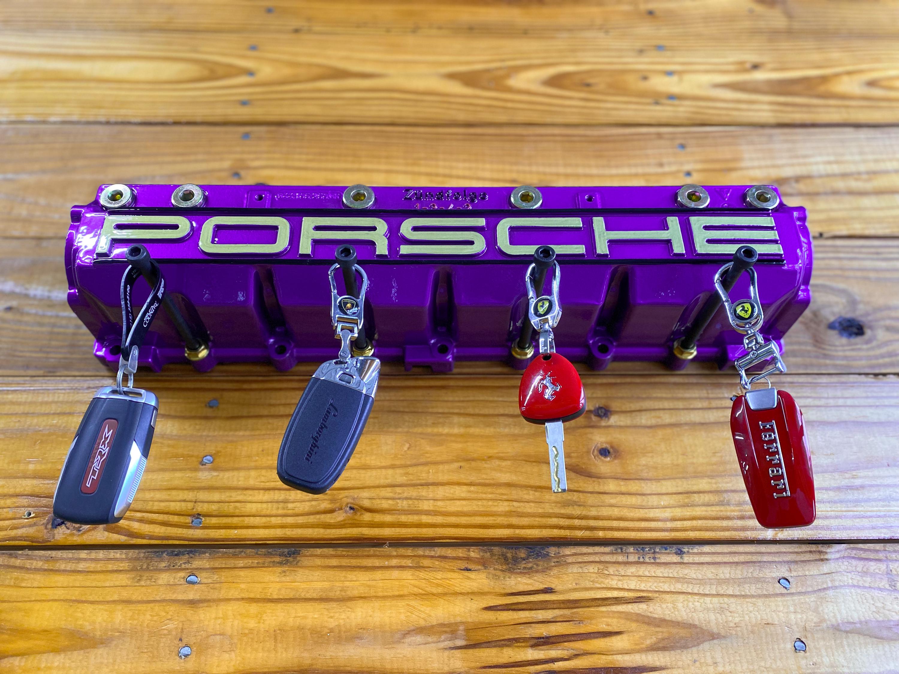 Upgrade your key organization with this Porsche 944 924S Cam Tower Housing Valve Cover Key Holder. A stunning piece painted in Viola Pearl. This unique accessory features custom airbrushed Porsche logos and hand-painted Porsche lettering, making it a true collector's item for automotive enthusiasts. With durable black steel bolt hangers, gold titanium nuts, and zinc-plated oil drain plugs, this key holder combines style and functionality, ensuring your keys are always within reach while showcasing your passion for Porsche