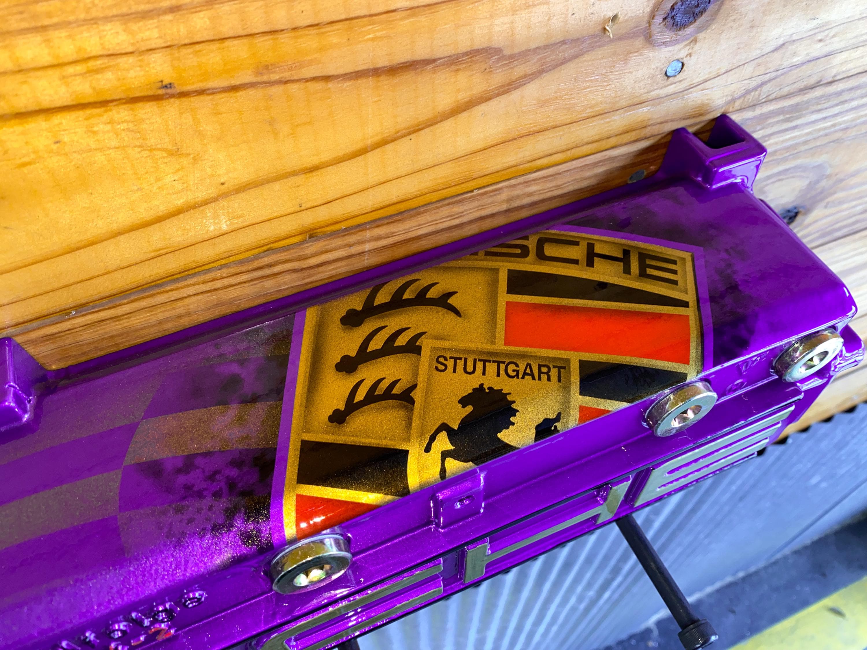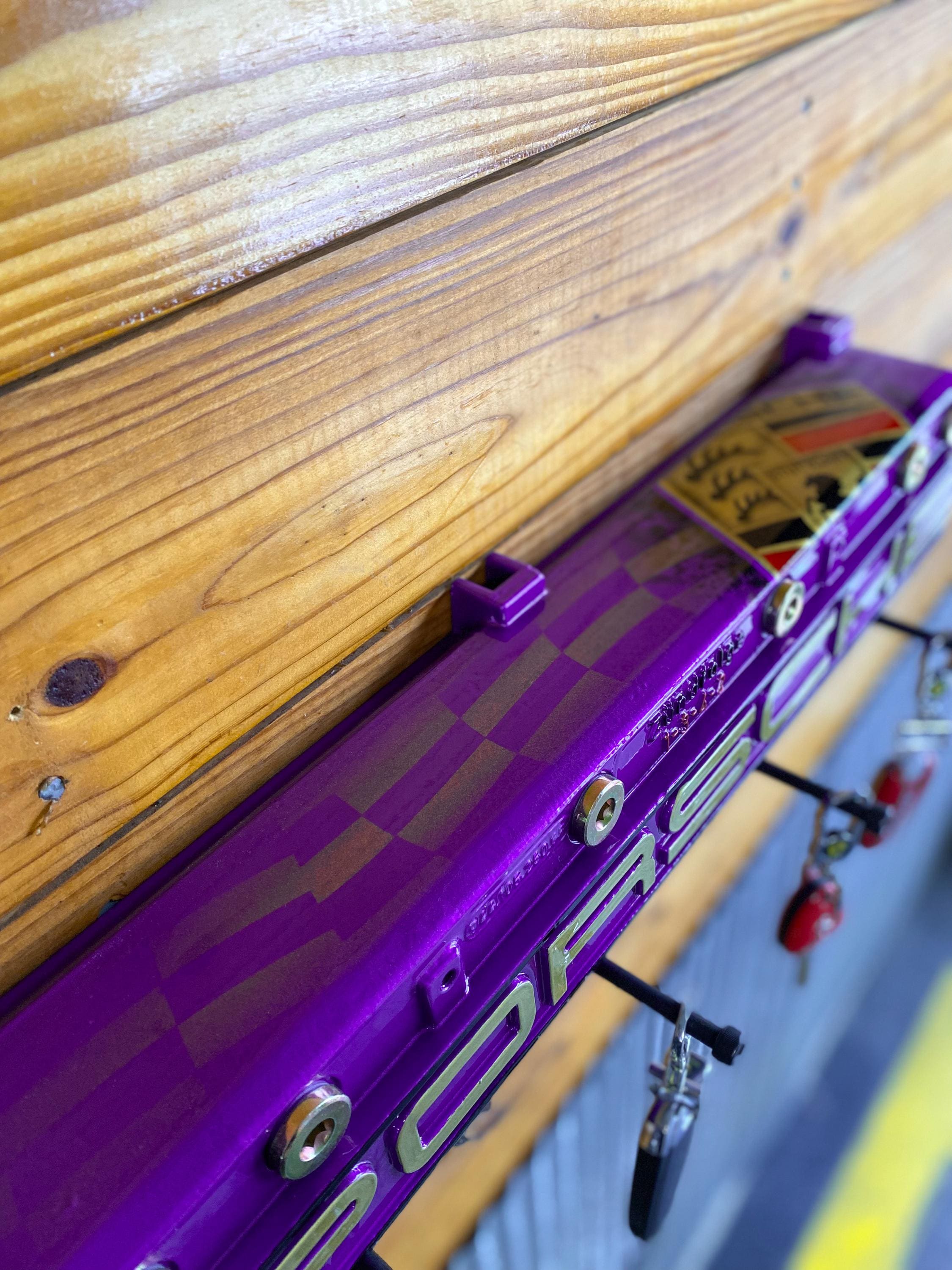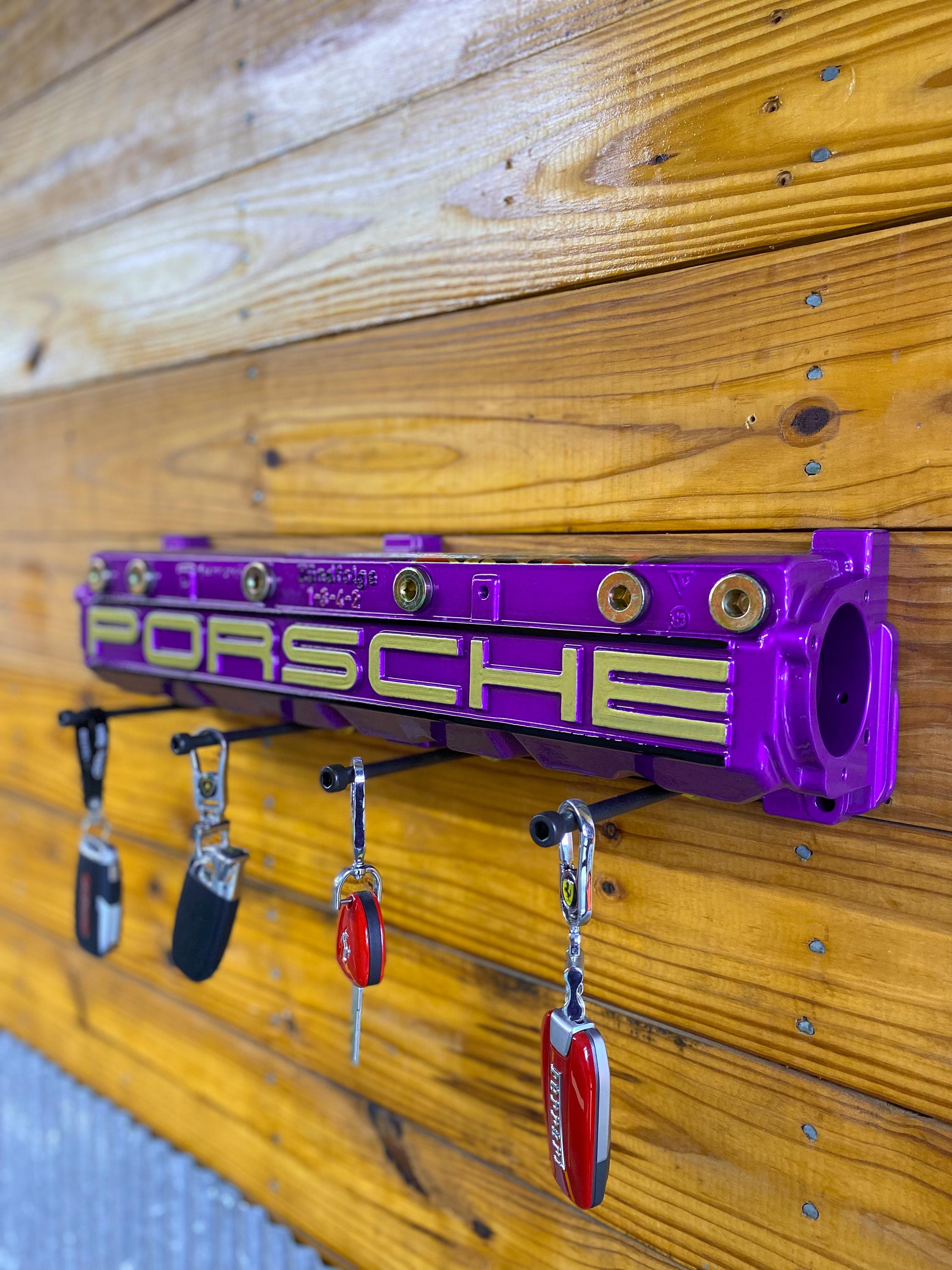 Upgrade your key organization with this Porsche 944 924S Cam Tower Housing Valve Cover Key Holder. A stunning piece painted in Viola Pearl. This unique accessory features custom airbrushed Porsche logos and hand-painted Porsche lettering, making it a true collector's item for automotive enthusiasts. With durable black steel bolt hangers, gold titanium nuts, and zinc-plated oil drain plugs, this key holder combines style and functionality, ensuring your keys are always within reach while showcasing your passion for Porsche