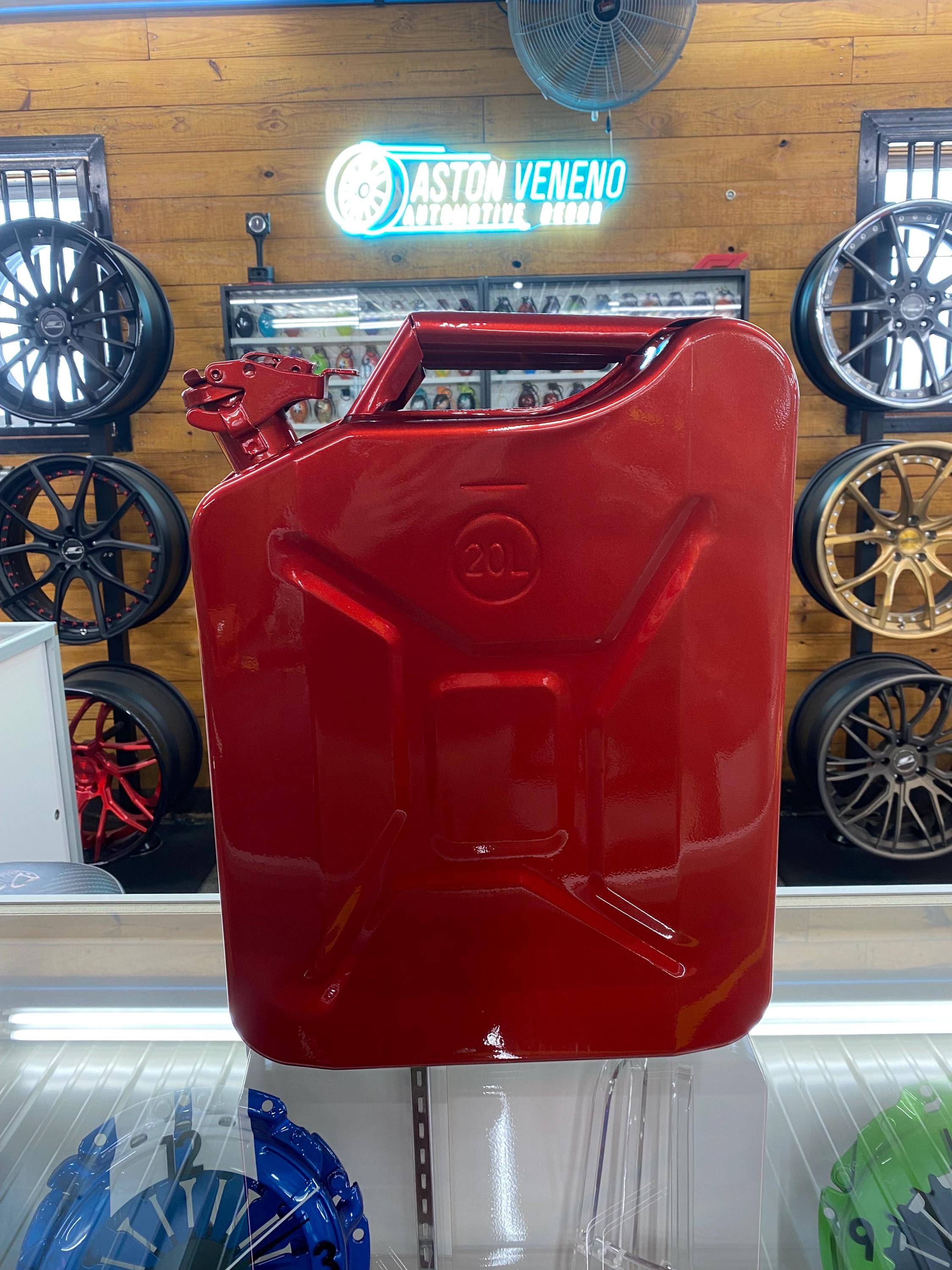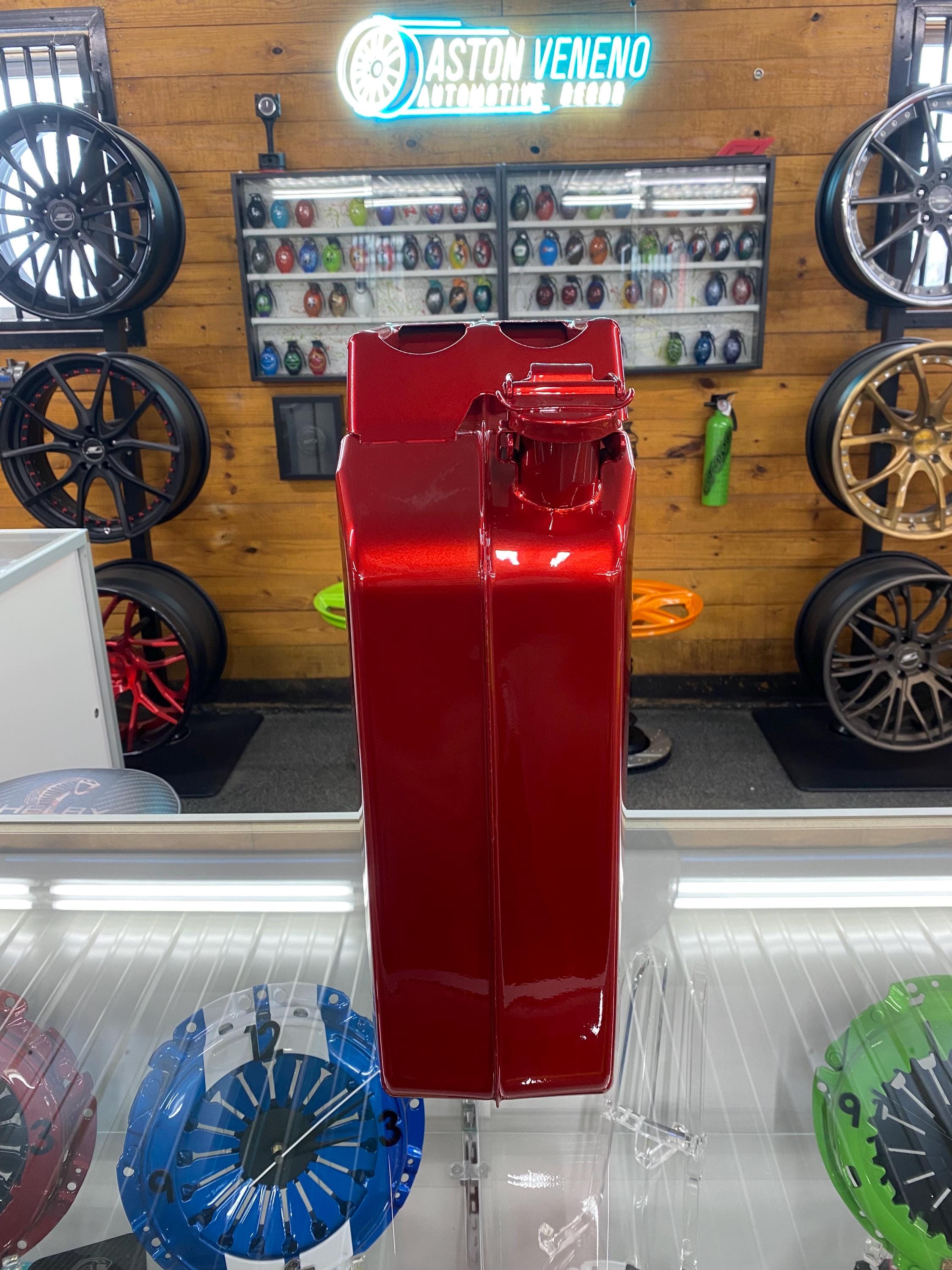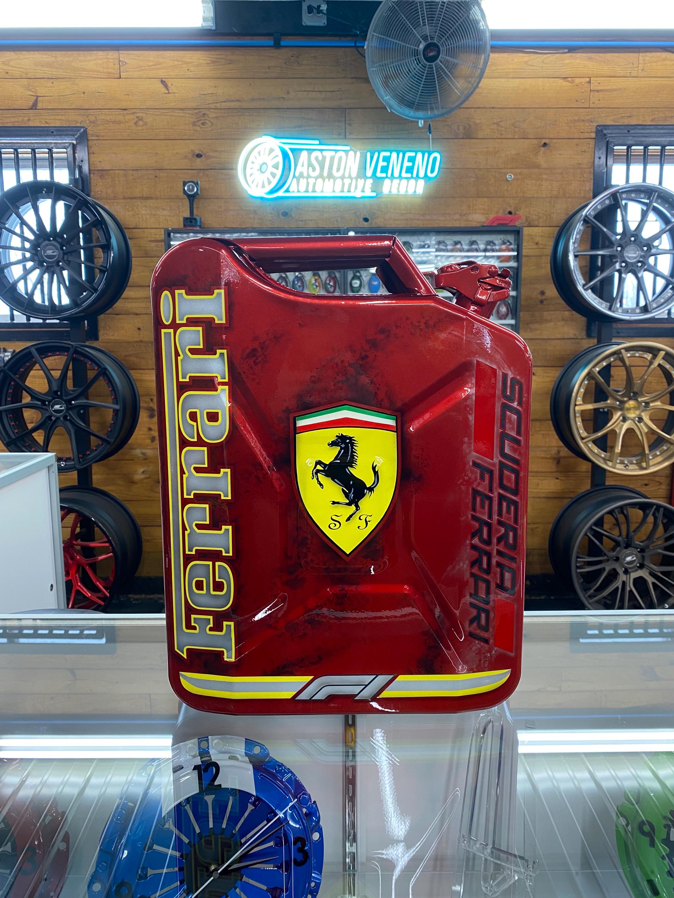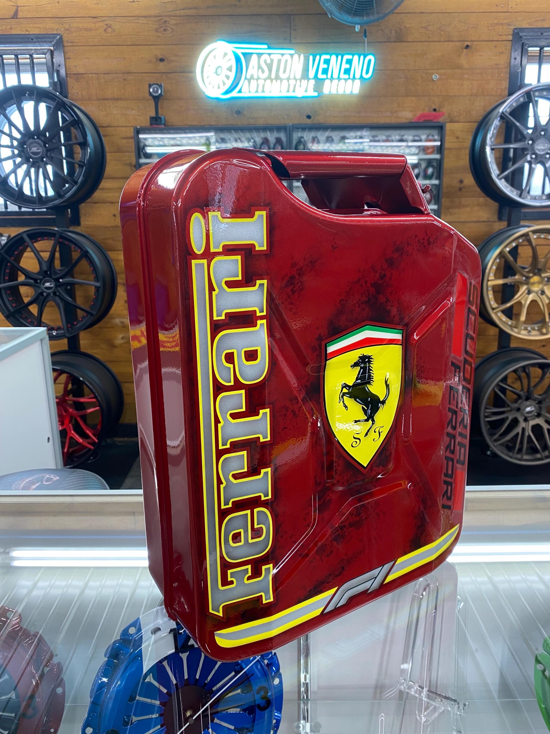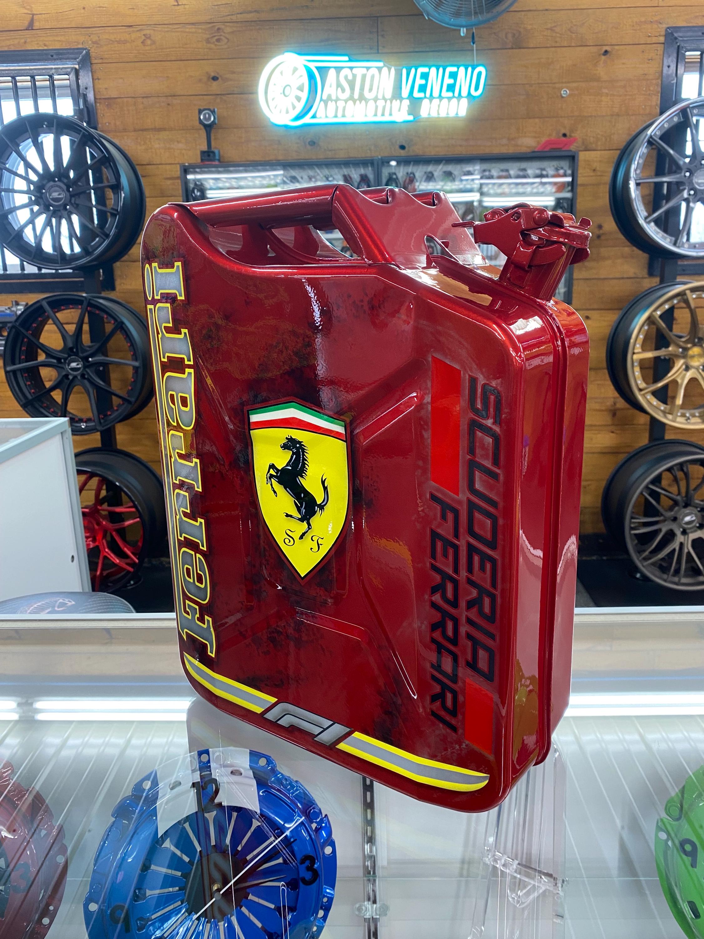 Ferrari delivers quality & this customized 5 Gallon Jerry can delivers it right back. This work of art is unique with Ferrari Factory Paint - Magma Red. This beatiful Red tri-coat paint job is followed with a custom airbrushed Ferrar F1 design!