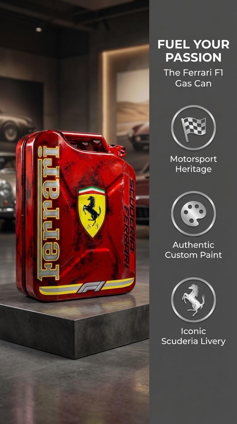 Rev up your collection with our exclusive Formula 1 Ferrari custom-painted gas can! This stunning piece is not just functional, its a tribute to the exhilarating world of motorsport. Each gas can is meticulously crafted and painted to reflect the iconic designs of these legendary racing teams, making them perfect for display or as a unique gift for car enthusiasts. Elevate your garage or man cave with these eye-catching collectibles that celebrate speed, style, and the spirit of competition. Don’t miss your chance to own a piece of racing history, grab yours today and fuel your passion for speed!⛽️🏁
