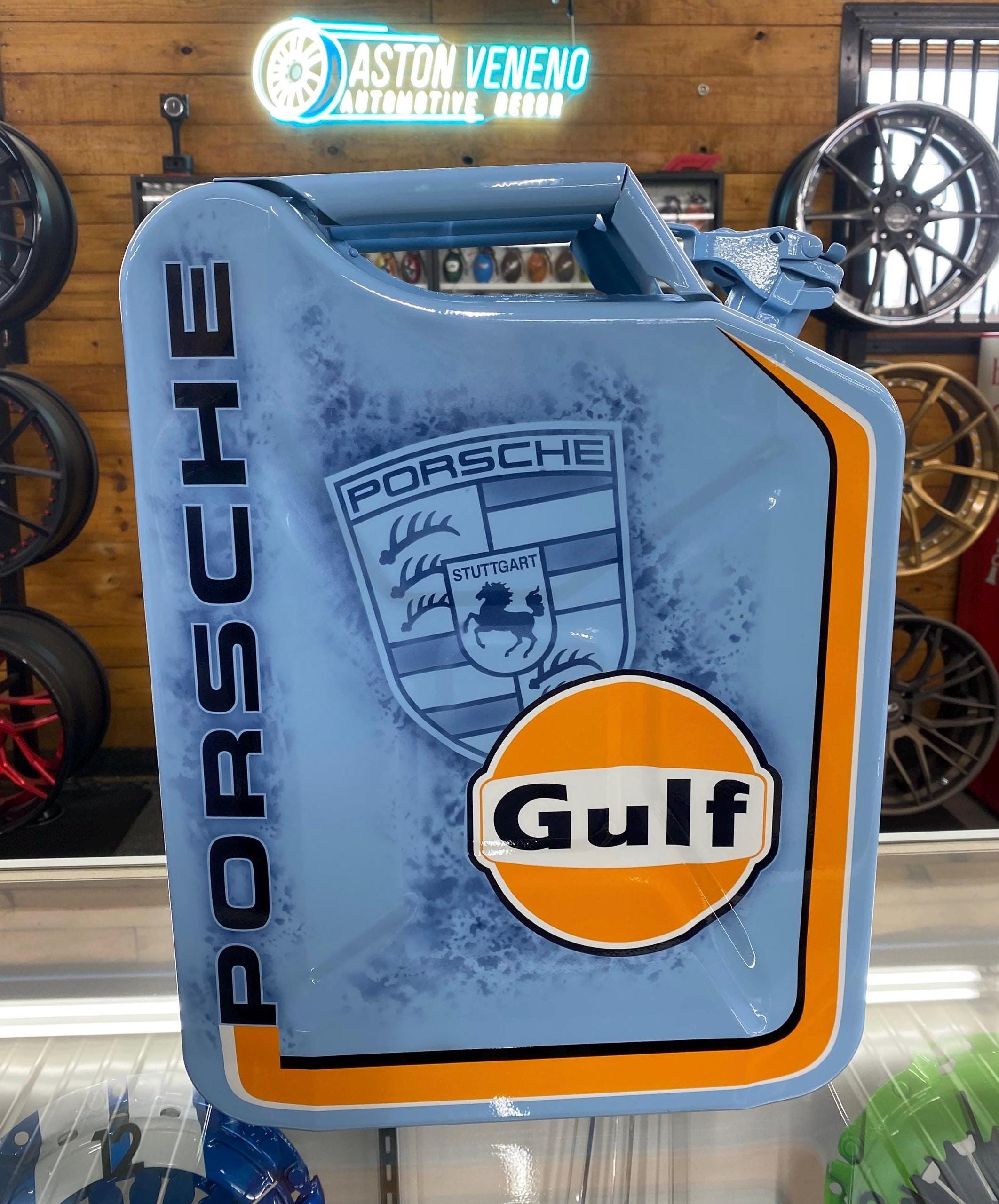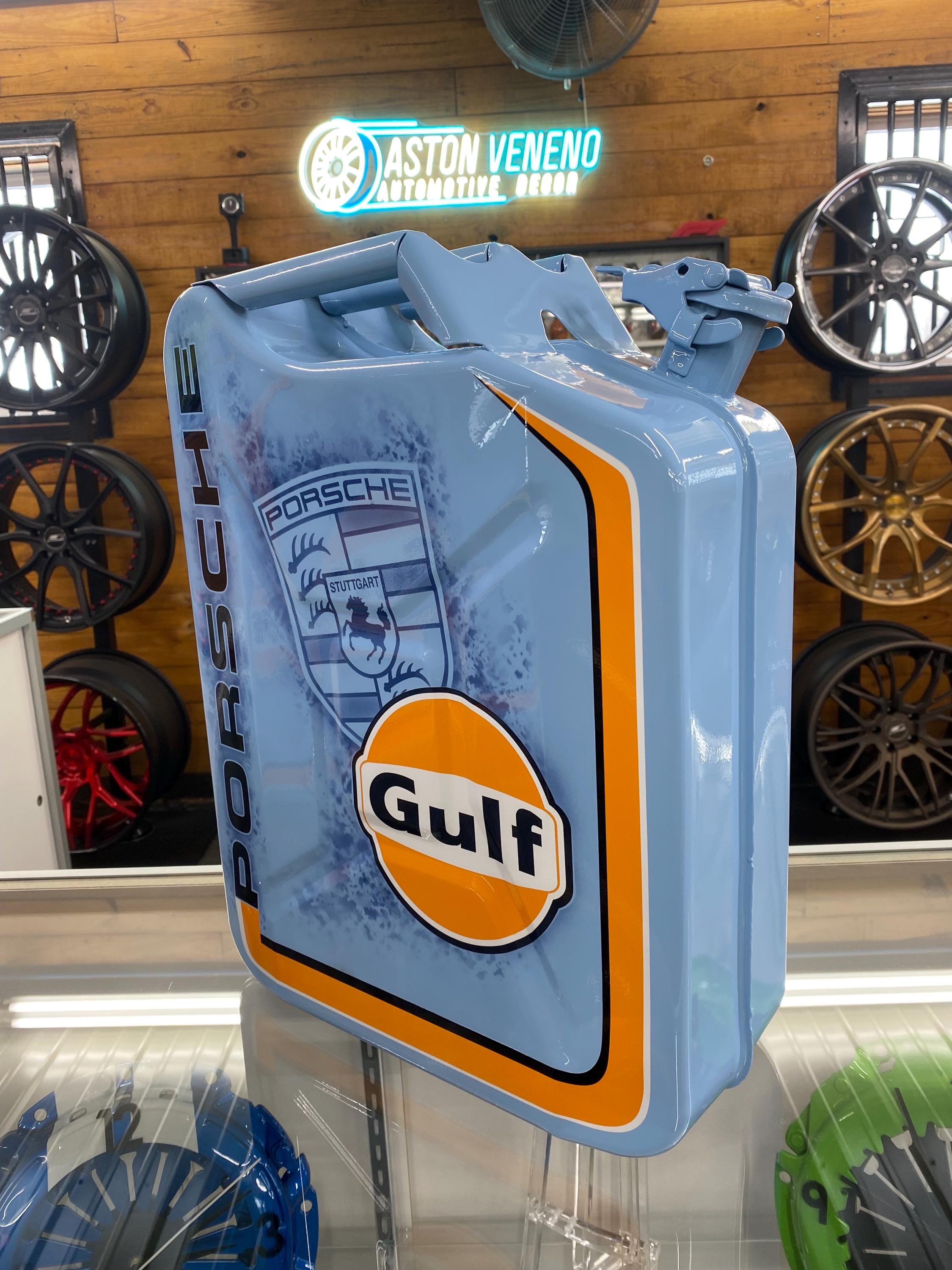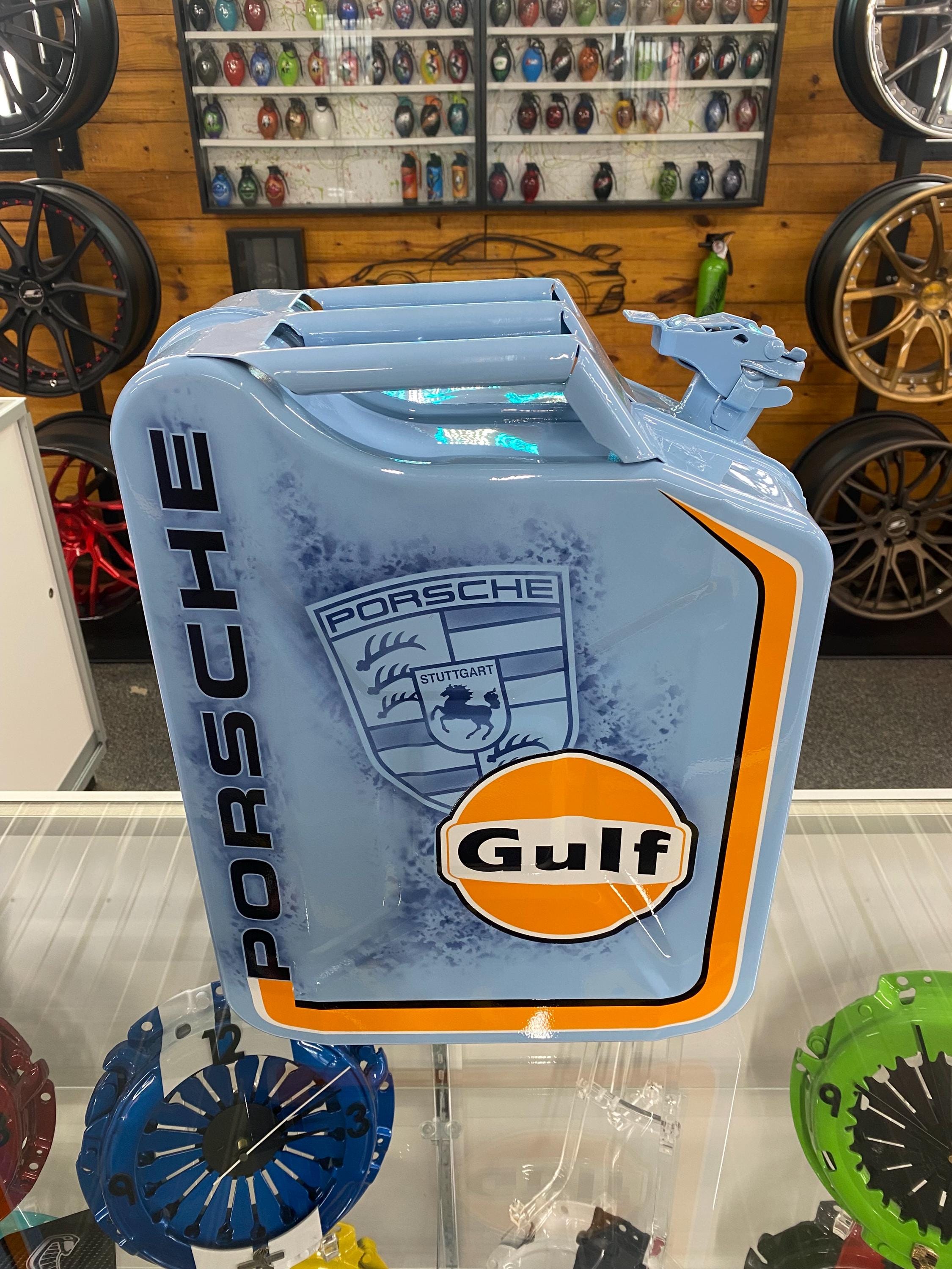 Discover this custom Gulf Porsche Painted Gas Can, a perfect addition to any collector's display or automotive enthusiast's decor. This meticulously crafted can features the iconic Gulf Oil logo & Porsche logos. This can serves as a unique conversation starter while adding a touch of automotive flair to your space. Elevate your collection or gift it to a fellow enthusiast—this gas can is a timeless masterpiece.