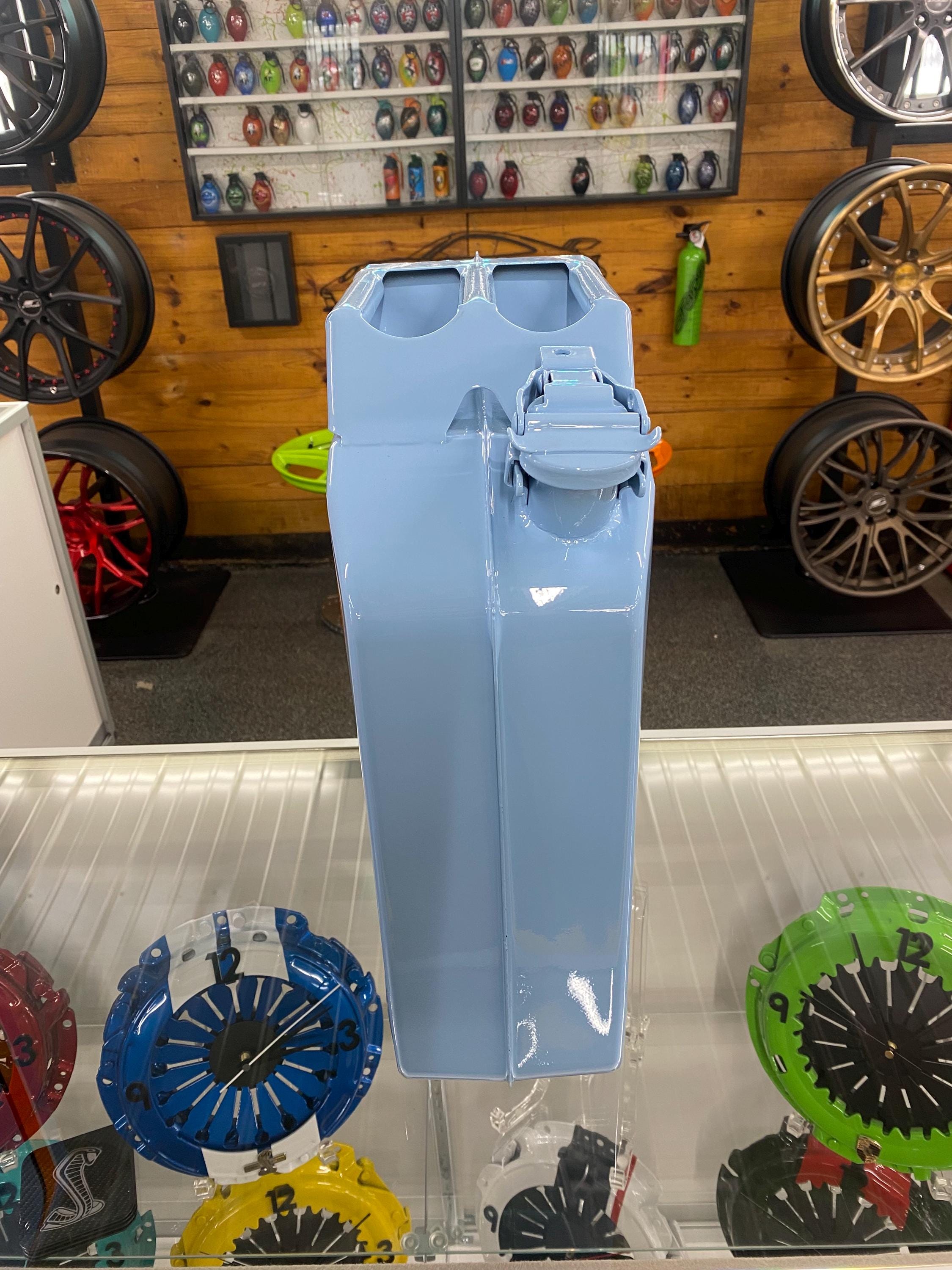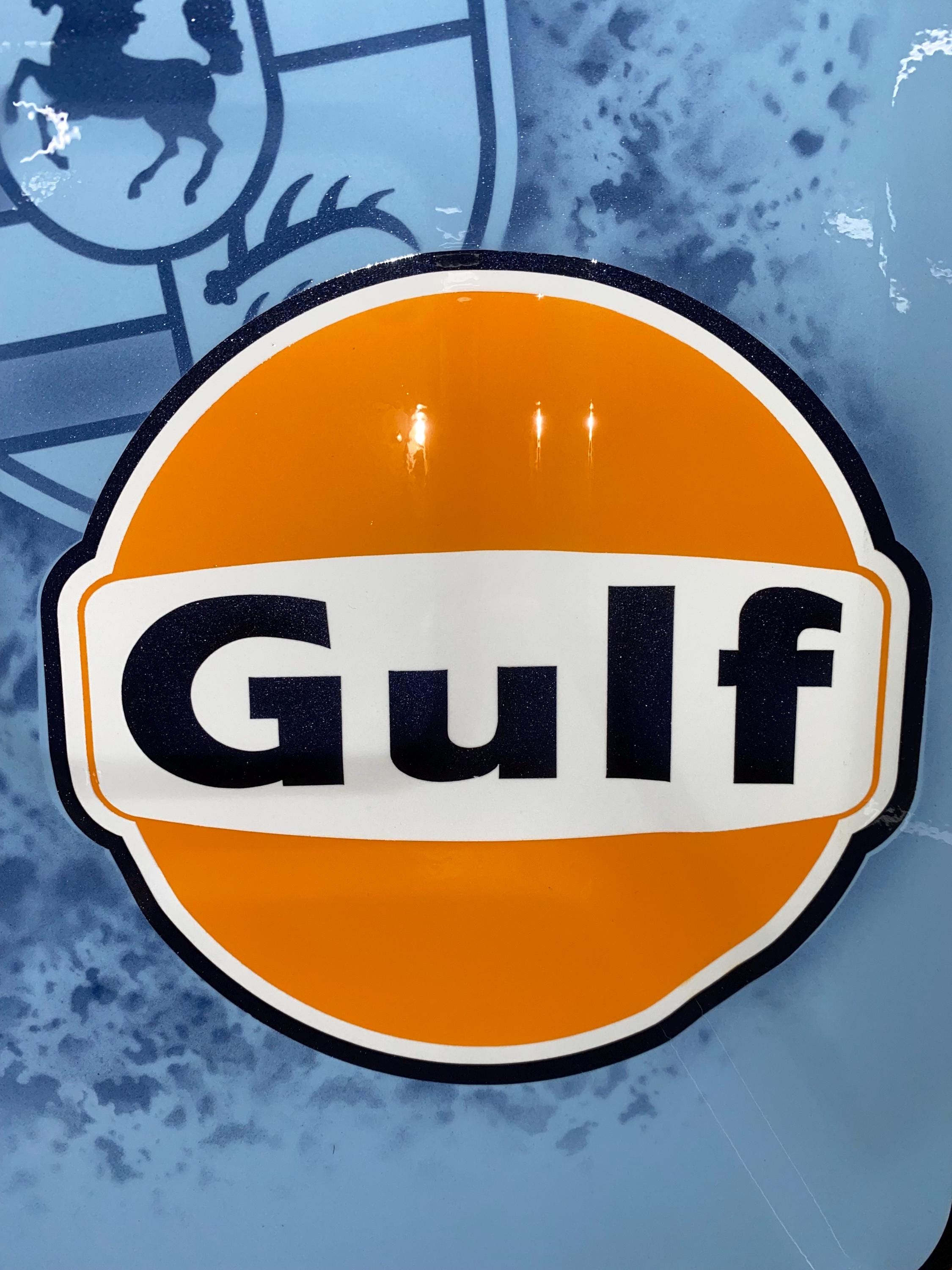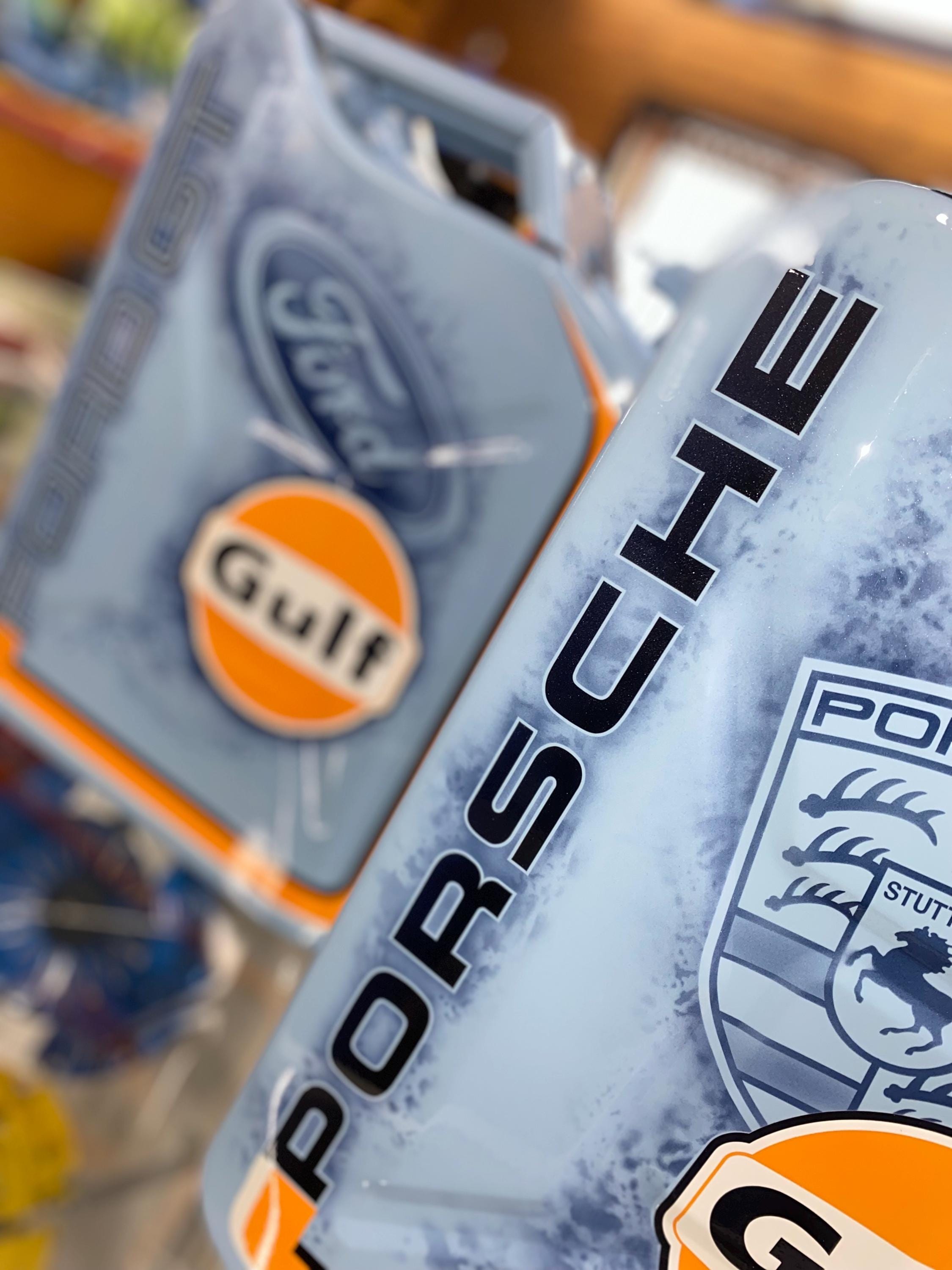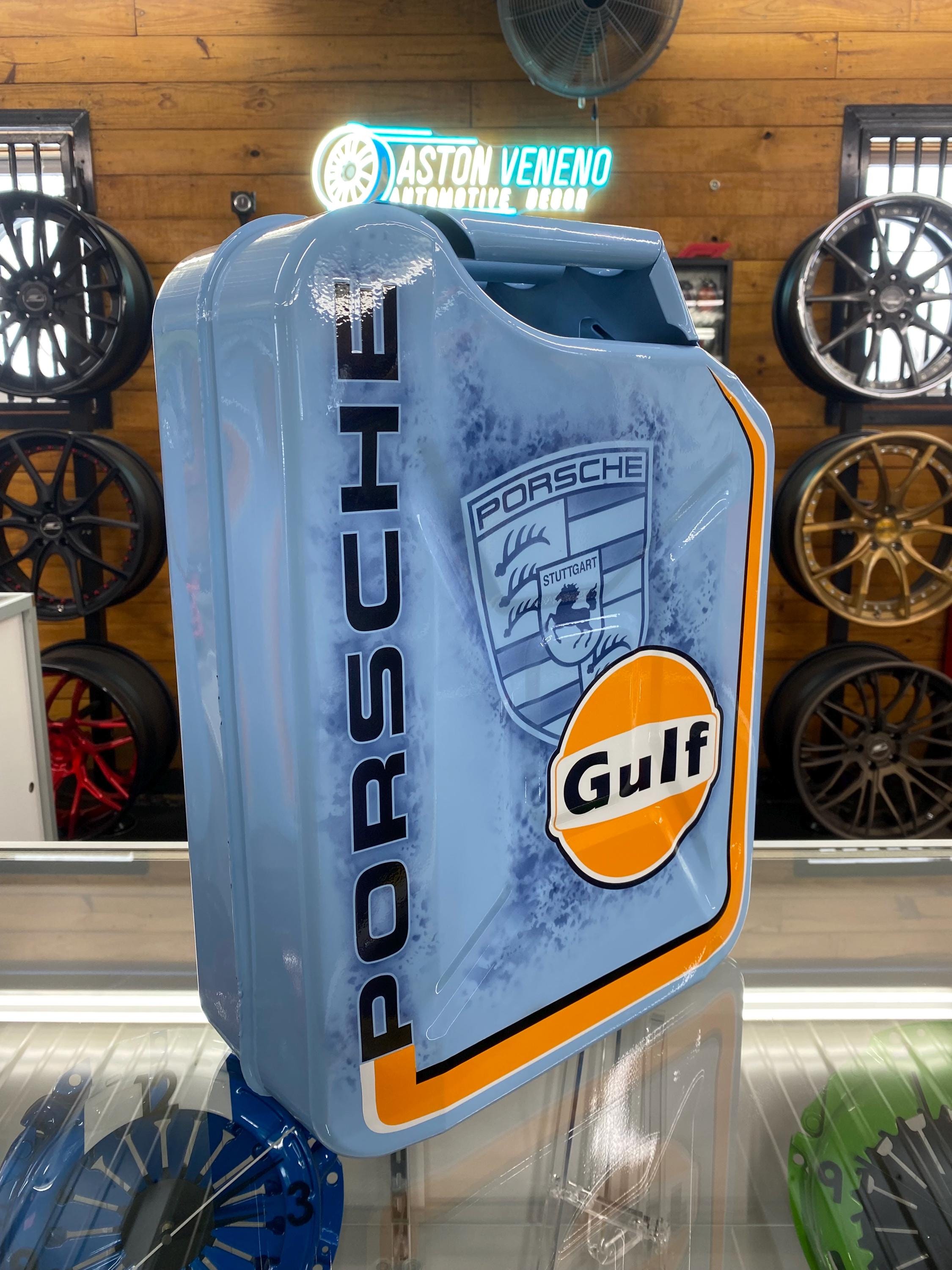 Discover this custom Gulf Porsche Painted Gas Can, a perfect addition to any collector's display or automotive enthusiast's decor. This meticulously crafted can features the iconic Gulf Oil logo & Porsche logos. This can serves as a unique conversation starter while adding a touch of automotive flair to your space. Elevate your collection or gift it to a fellow enthusiast—this gas can is a timeless masterpiece.