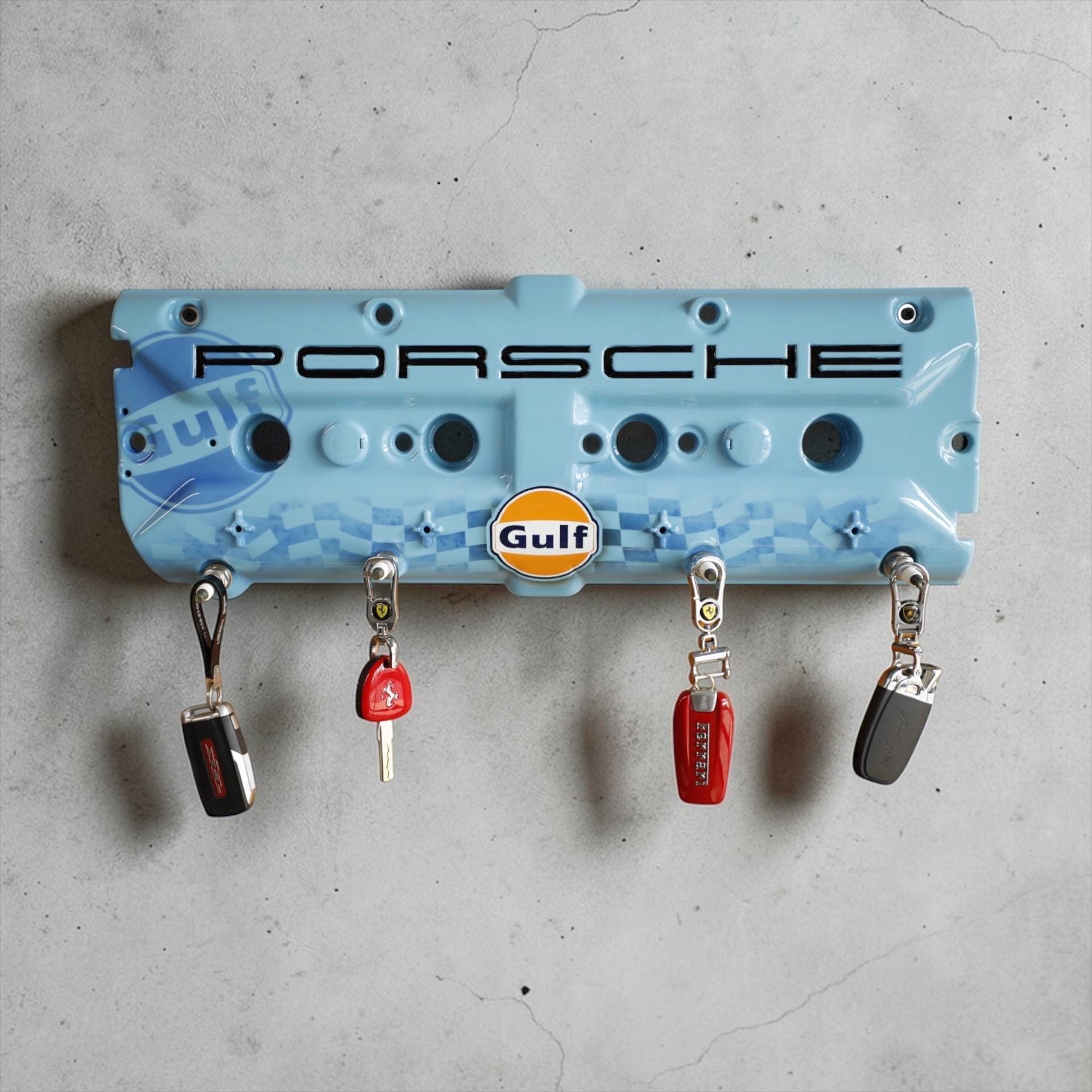 Upgrade your key organization with this Porsche 928 Gulf Valve Cover Key Holder. A stunning piece painted in Porsche Gulf Blue. This unique accessory features custom airbrushed Gulf logo and hand-painted Porsche lettering, making it a true collector's item for automotive enthusiasts. With durable spark plug hangers, this key holder combines style and functionality, ensuring your keys are always within reach while showcasing your passion for Porsche