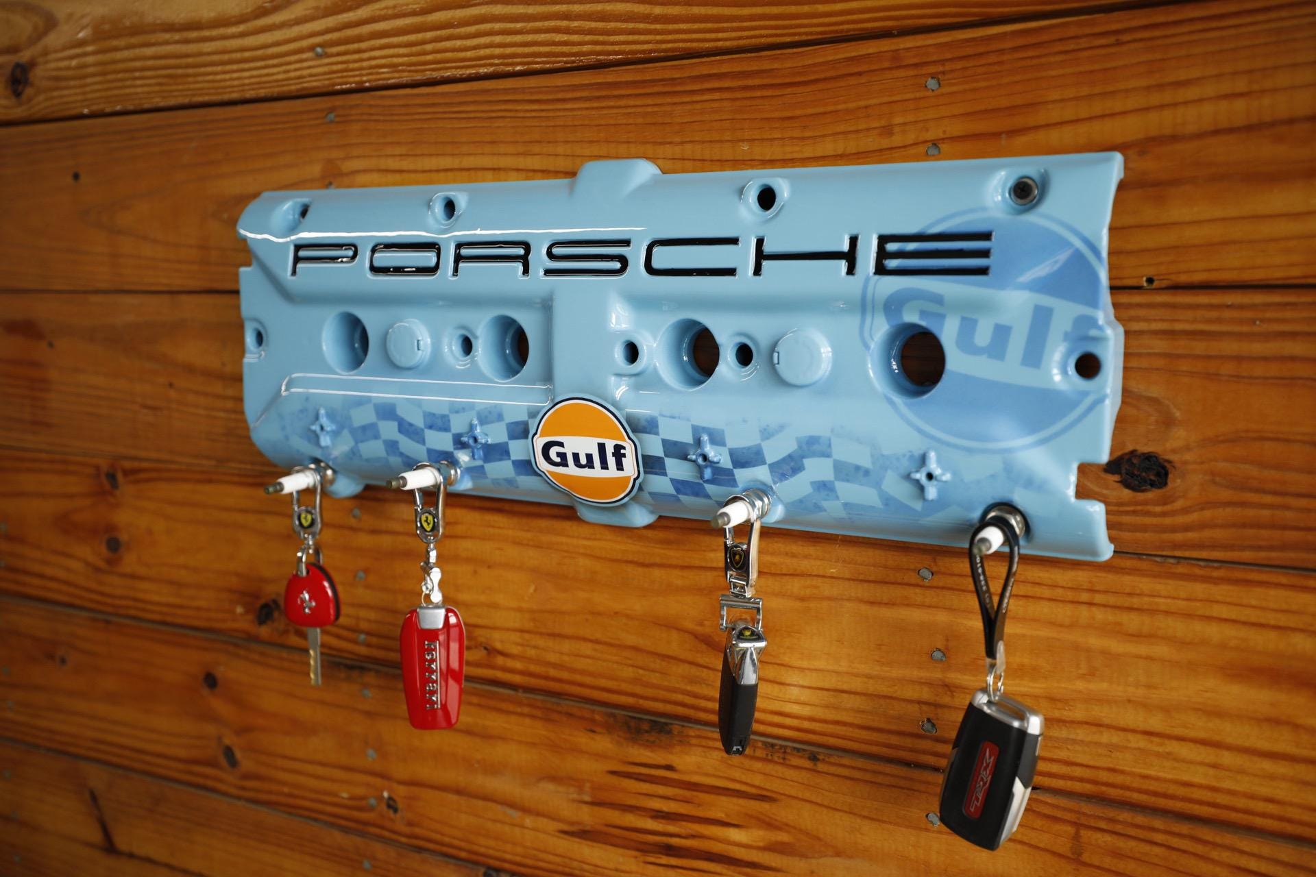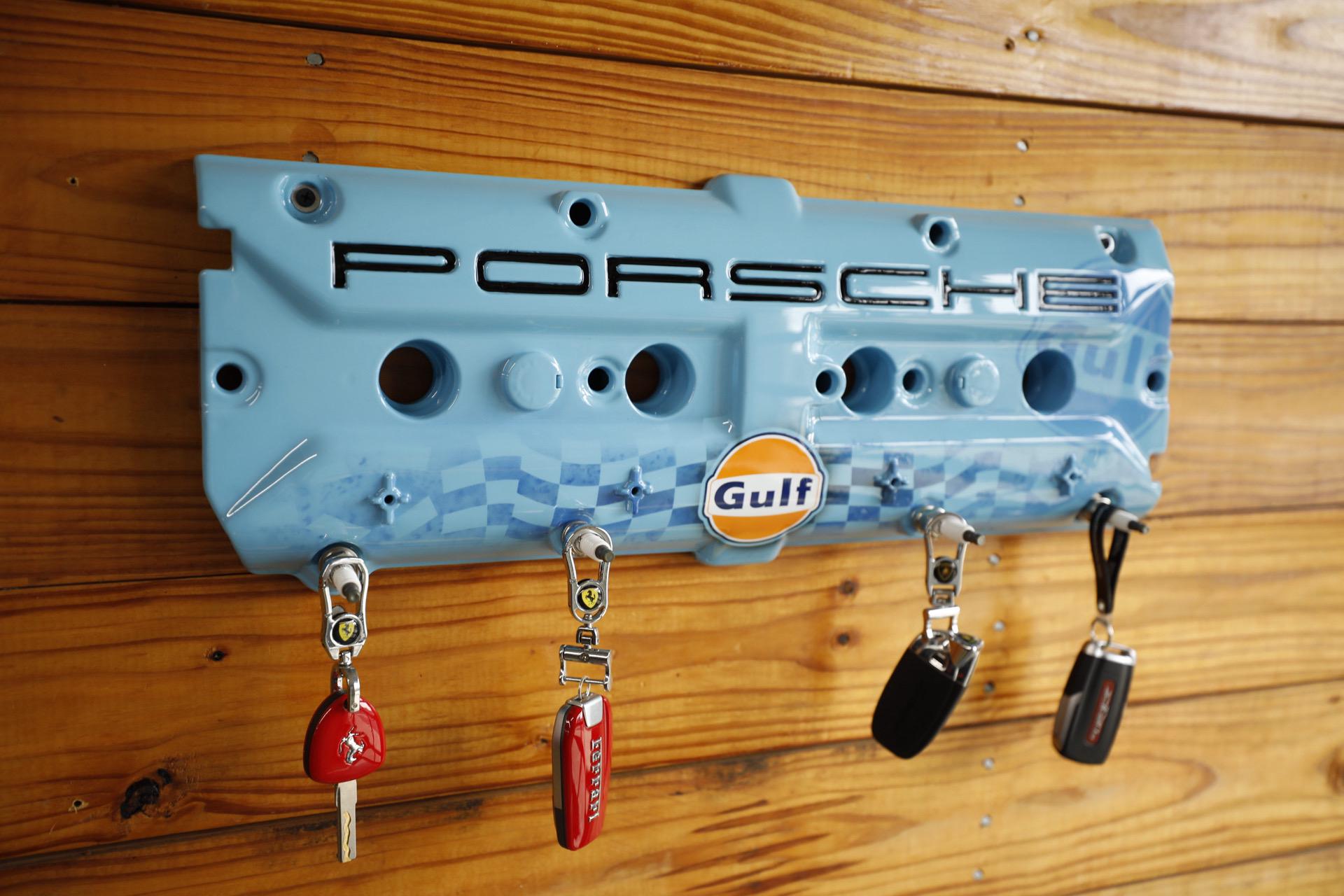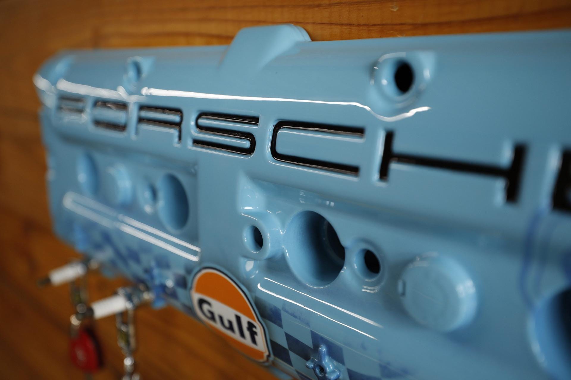 Upgrade your key organization with this Porsche 928 Gulf Valve Cover Key Holder. A stunning piece painted in Porsche Gulf Blue. This unique accessory features custom airbrushed Gulf logo and hand-painted Porsche lettering, making it a true collector's item for automotive enthusiasts. With durable spark plug hangers, this key holder combines style and functionality, ensuring your keys are always within reach while showcasing your passion for Porsche