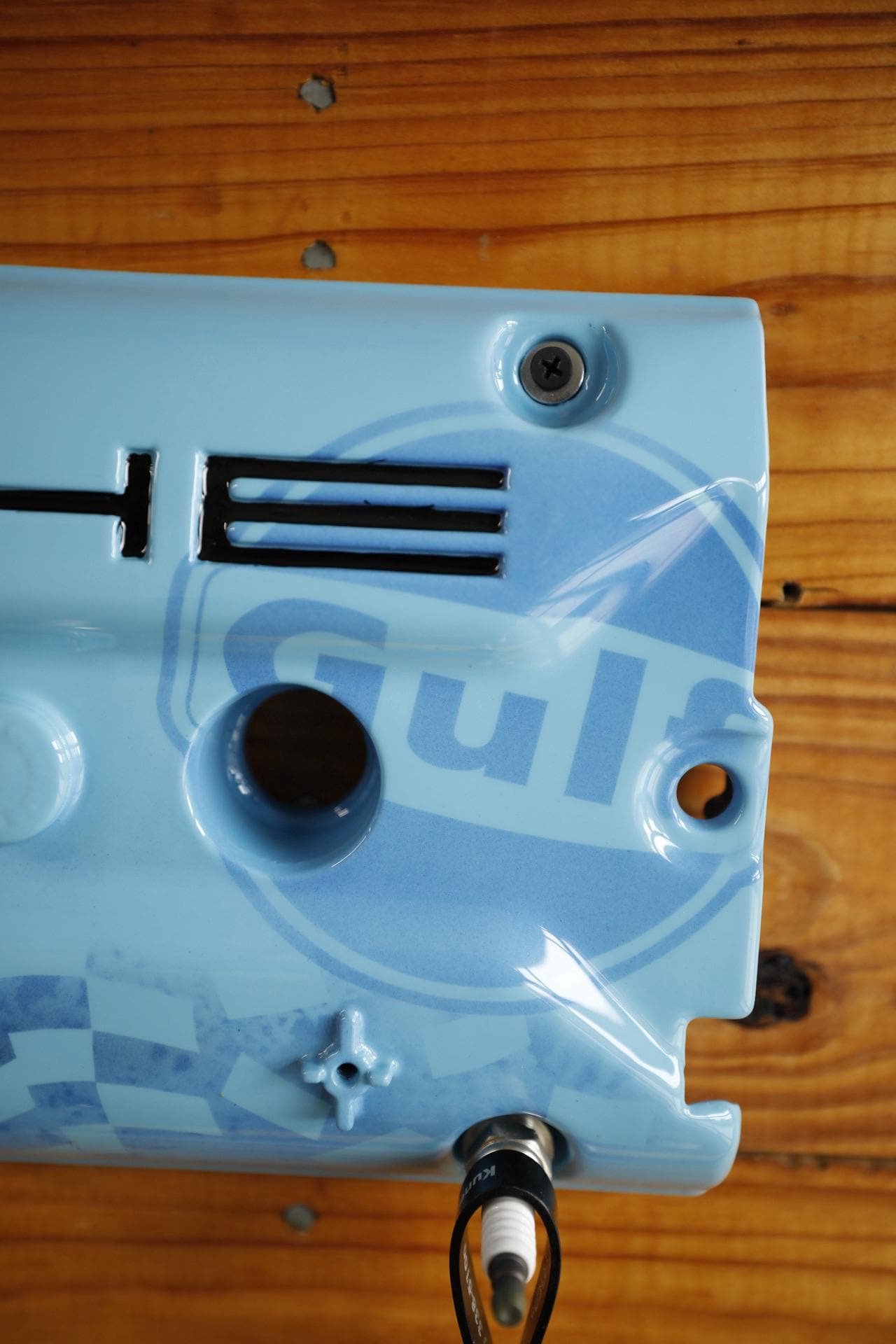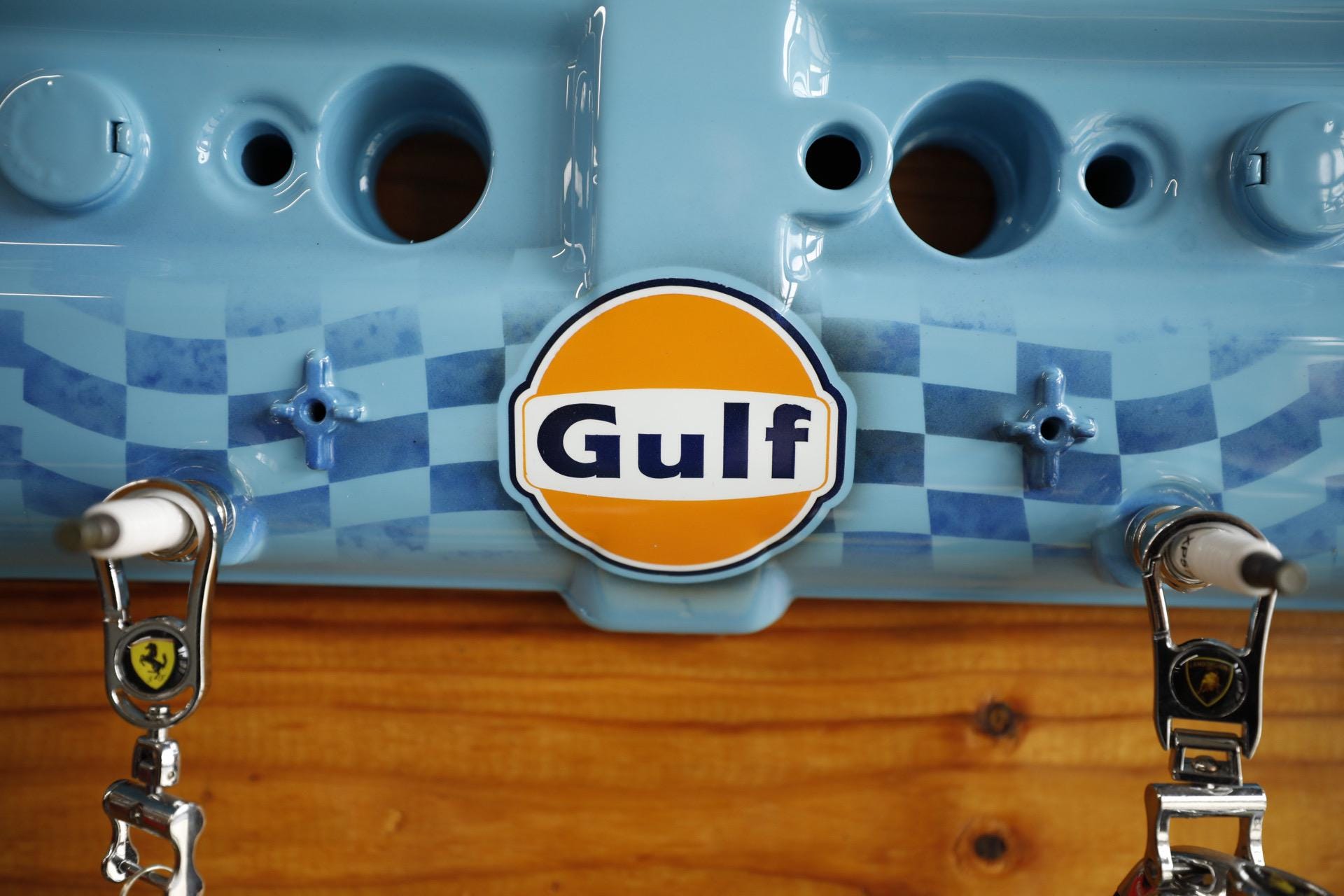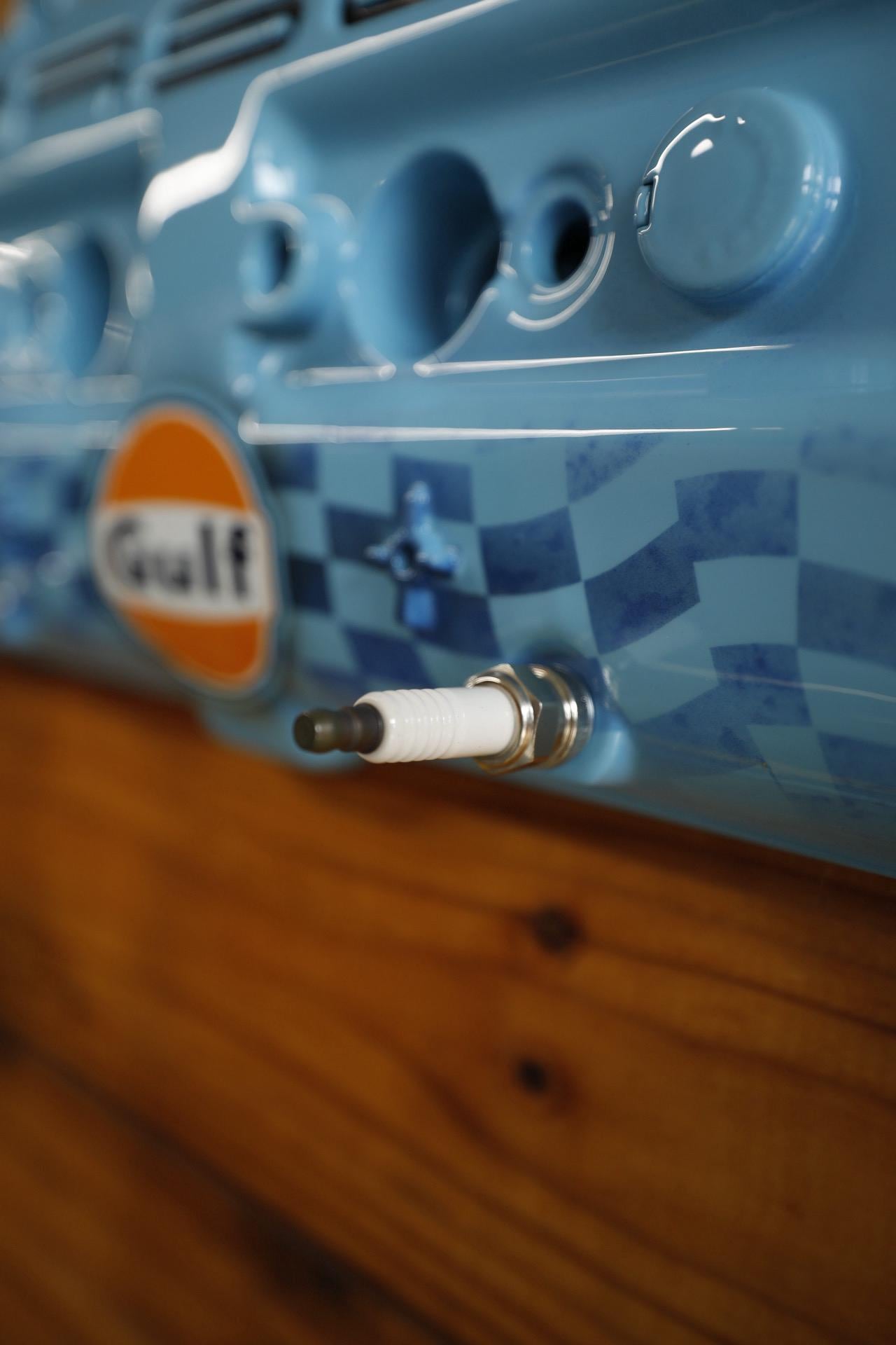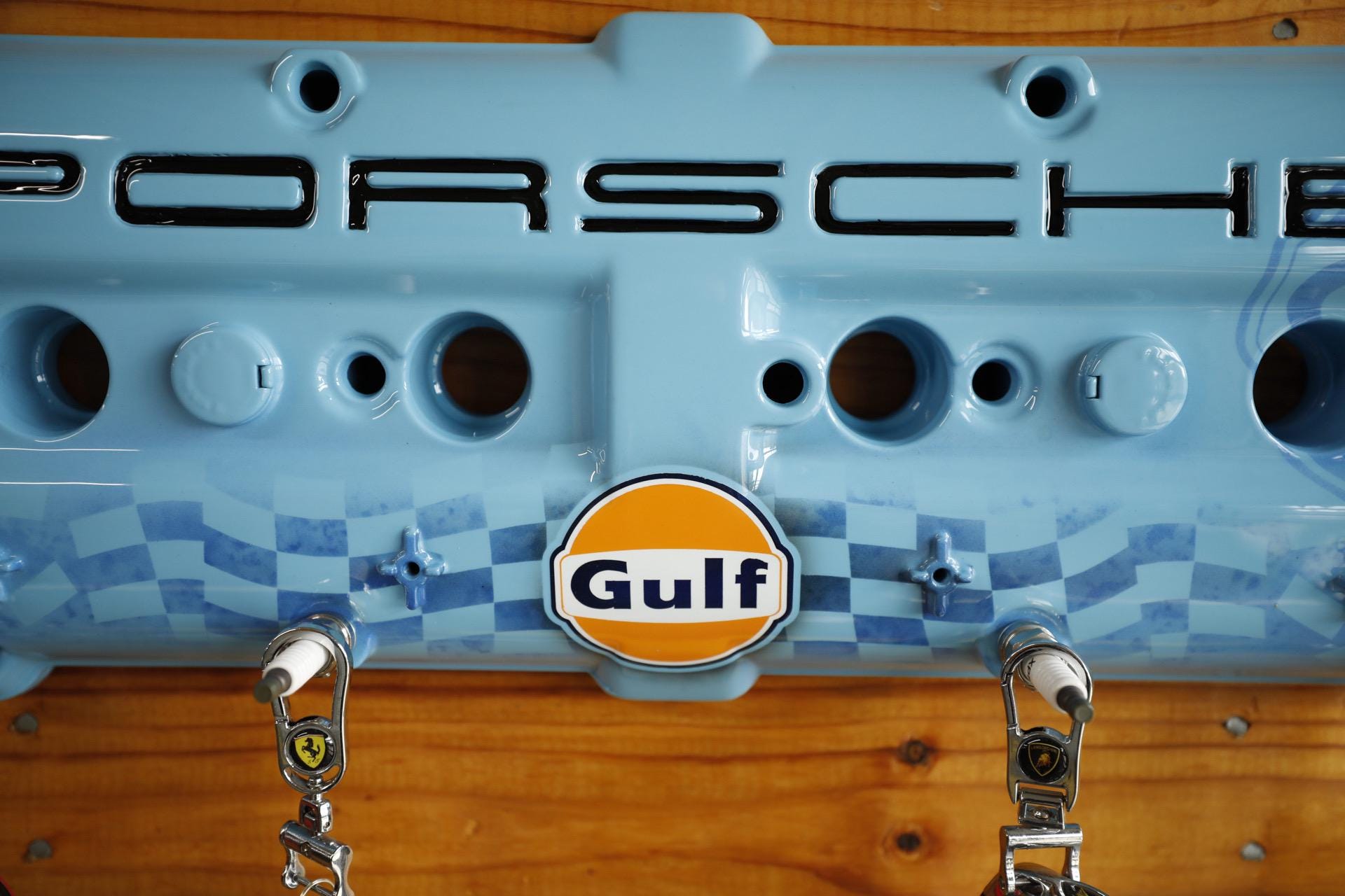 Upgrade your key organization with this Porsche 928 Gulf Valve Cover Key Holder. A stunning piece painted in Porsche Gulf Blue. This unique accessory features custom airbrushed Gulf logo and hand-painted Porsche lettering, making it a true collector's item for automotive enthusiasts. With durable spark plug hangers, this key holder combines style and functionality, ensuring your keys are always within reach while showcasing your passion for Porsche