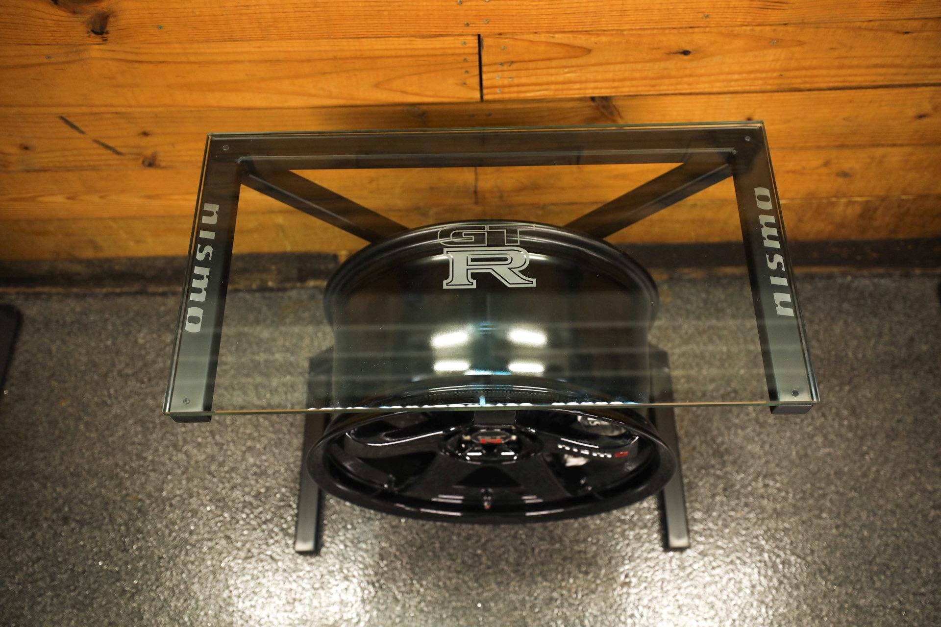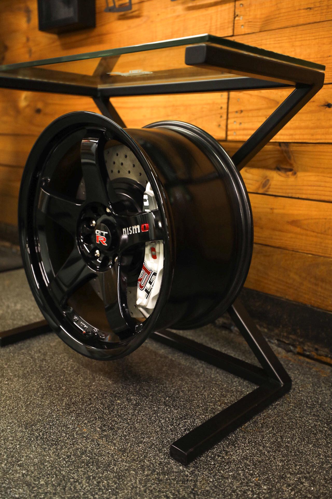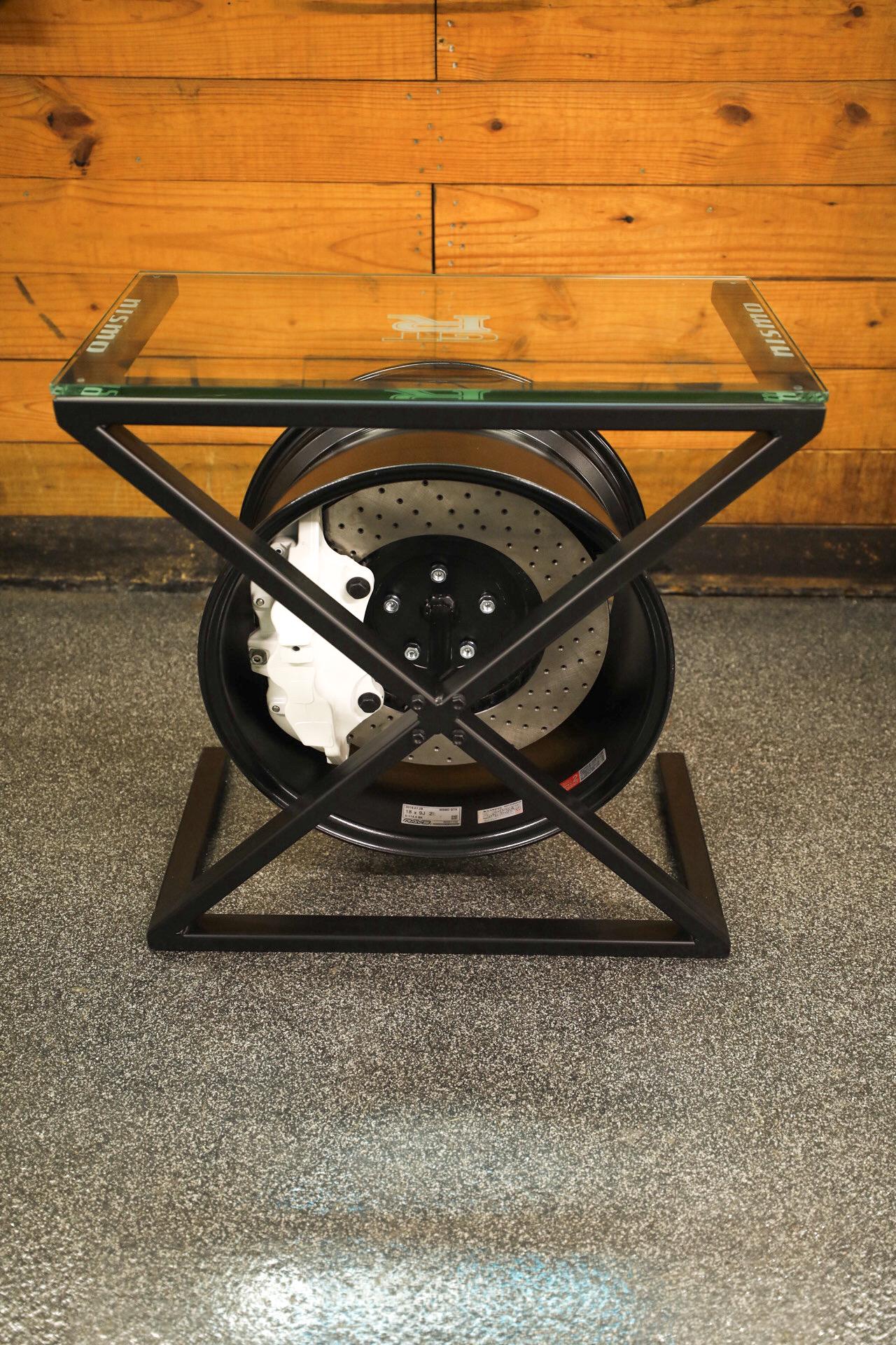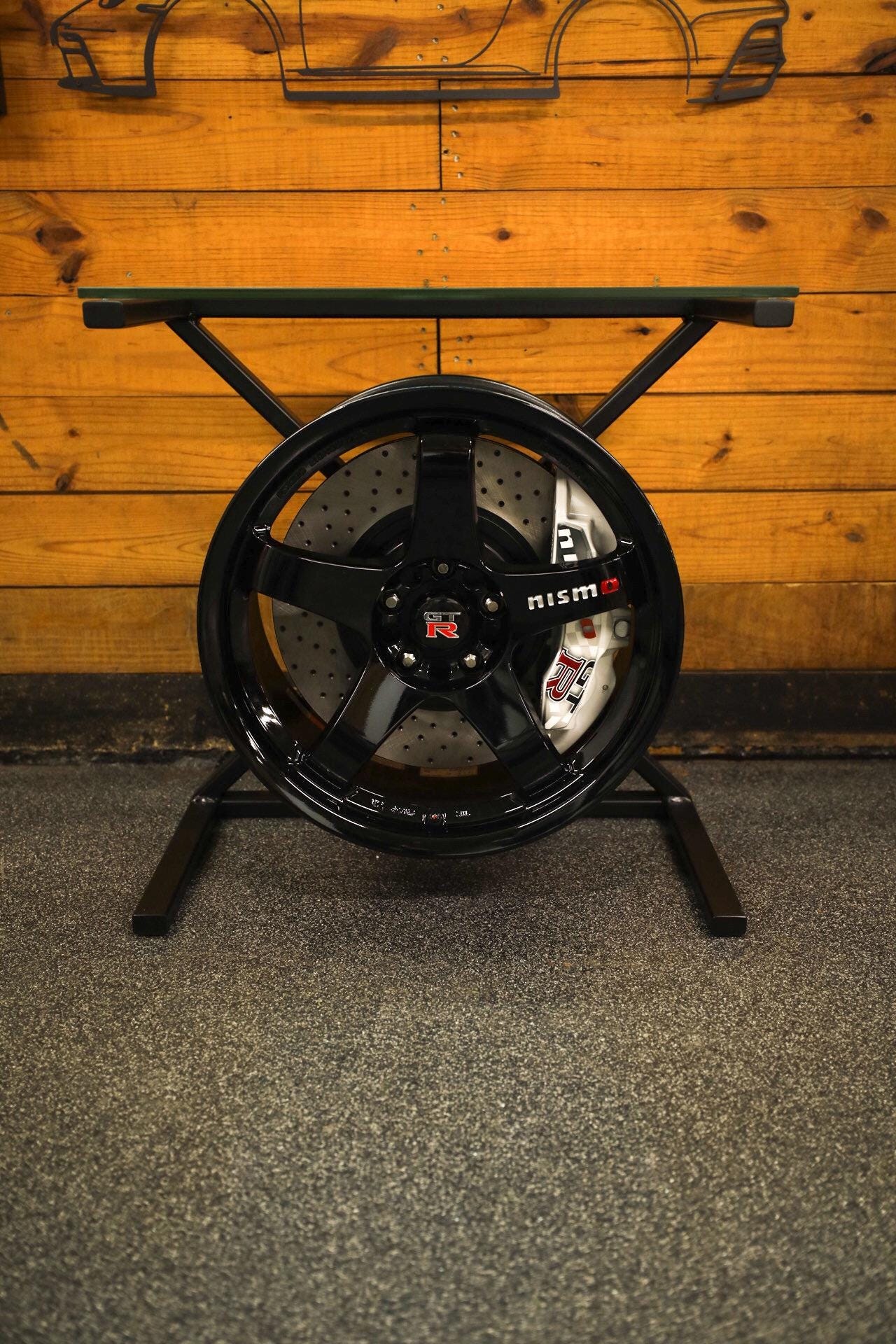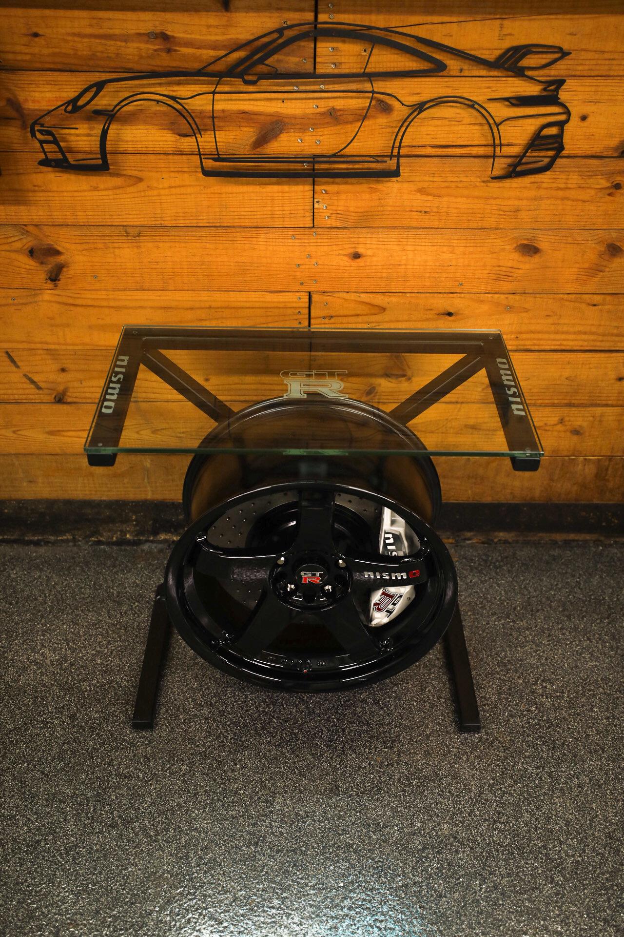 Enhance your space with this stunning Nissan GT-R wheel table. This unique piece showcases custom etched glass with a custom matte black painted steel frame, perfectly complementing the sleek design of the rotor & Pearl White painted caliper. It's a perfect match for automotive enthusiasts, this table is not just furniture; it's a statement of style and passion for performance.